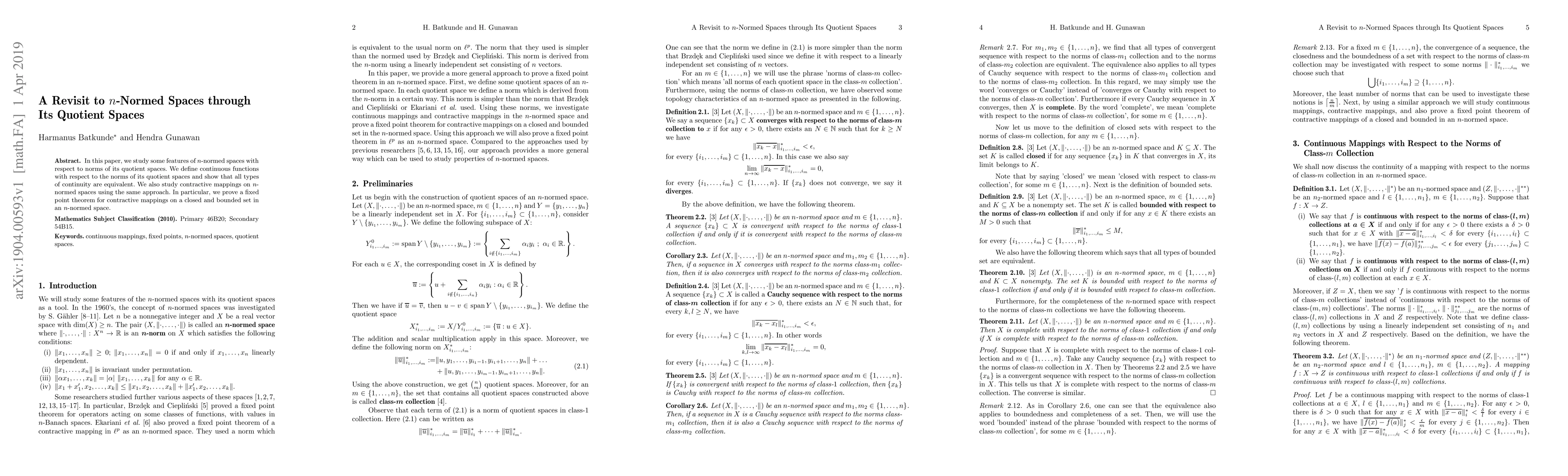 This paper investigates properties of n-normed spaces via their quotient spaces, establishing the equivalence of various continuity types and proving a fixed point theorem for contractive mappings on closed, bounded sets within these spaces.