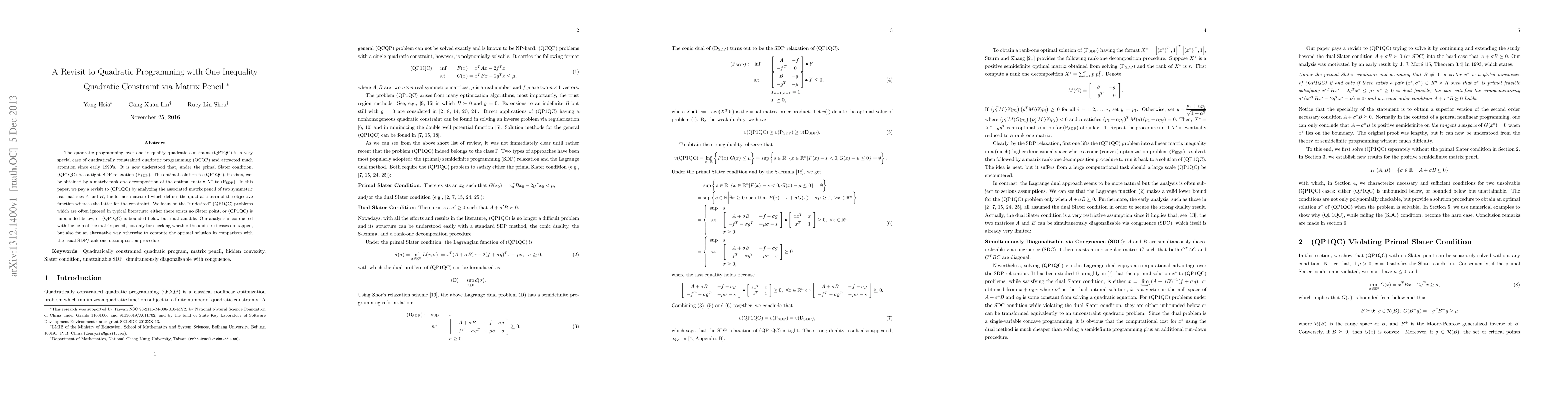 This paper revisits quadratic programming with one inequality quadratic constraint (QP1QC) using a matrix pencil approach, analyzing undesired cases where no Slater point exists, the problem is unbounded, or the solution is unattainable. It proposes an alternative method to compute the optimal solution via matrix rank decomposition.