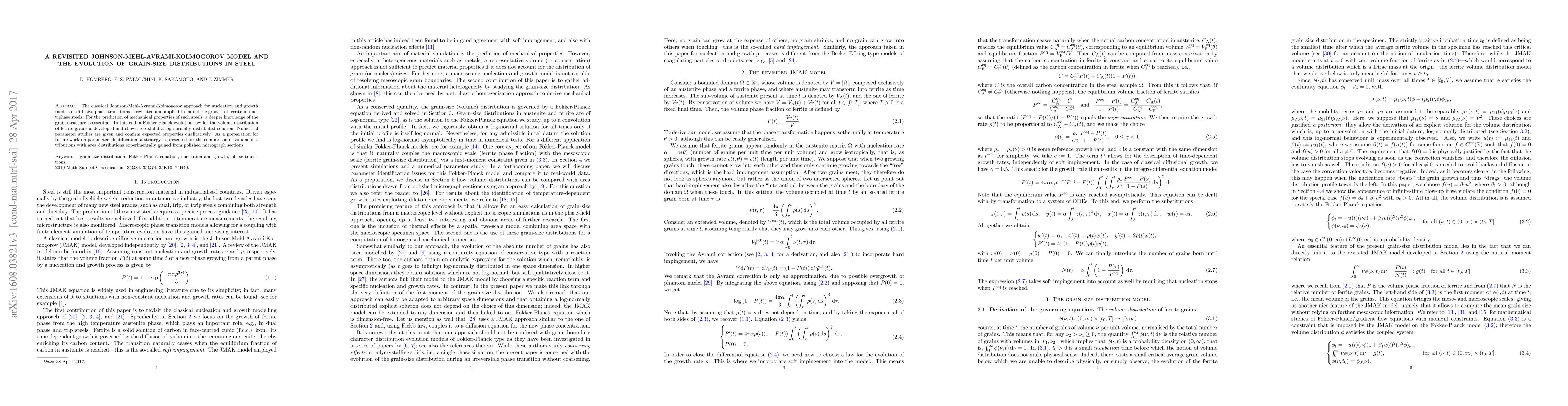 This paper revisits the Johnson-Mehl-Avrami-Kolmogorov model to study the growth of ferrite in multiphase steels, developing a Fokker-Planck evolution law that predicts a log-normally distributed grain size. It also proposes a strategy for comparing experimental area distributions from micrographs to volume distributions for future parameter identification.