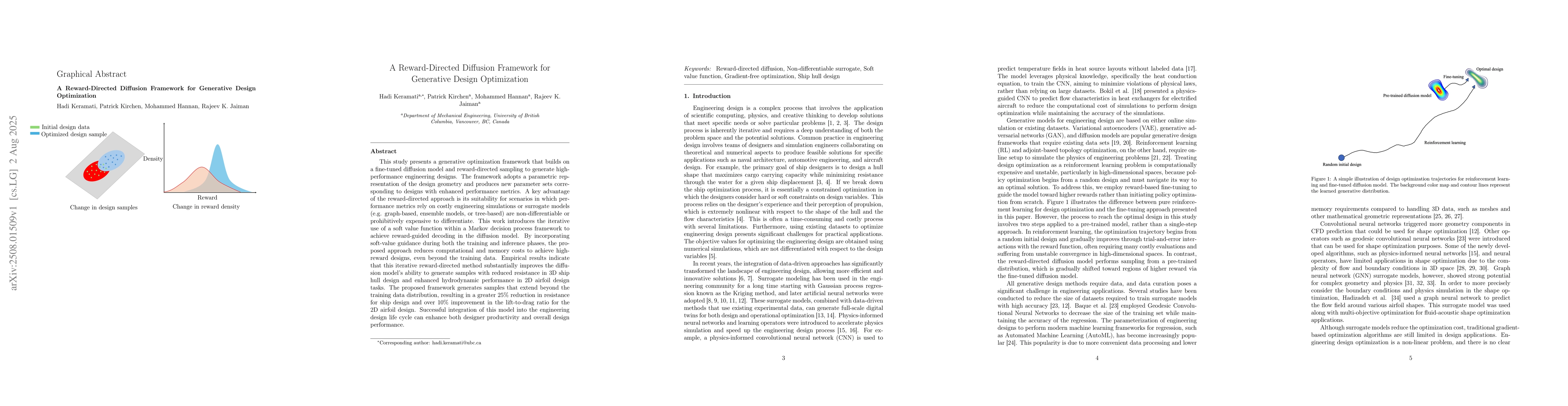 This study presents a generative optimization framework that builds on a fine-tuned diffusion model and reward-directed sampling to generate high-performance engineering designs. The framework adopts a parametric representation of the design geometry and produces new parameter sets corresponding to designs with enhanced performance metrics. A key advantage of the reward-directed approach is its suitability for scenarios in which performance metrics rely on costly engineering simulations or surrogate models (e.g. graph-based, ensemble models, or tree-based) are non-differentiable or prohibitively expensive to differentiate. This work introduces the iterative use of a soft value function within a Markov decision process framework to achieve reward-guided decoding in the diffusion model. By incorporating soft-value guidance during both the training and inference phases, the proposed approach reduces computational and memory costs to achieve high-reward designs, even beyond the training data. Empirical results indicate that this iterative reward-directed method substantially improves the ability of the diffusion models to generate samples with reduced resistance in 3D ship hull design and enhanced hydrodynamic performance in 2D airfoil design tasks. The proposed framework generates samples that extend beyond the training data distribution, resulting in a greater 25 percent reduction in resistance for ship design and over 10 percent improvement in the lift-to-drag ratio for the 2D airfoil design. Successful integration of this model into the engineering design life cycle can enhance both designer productivity and overall design performance.