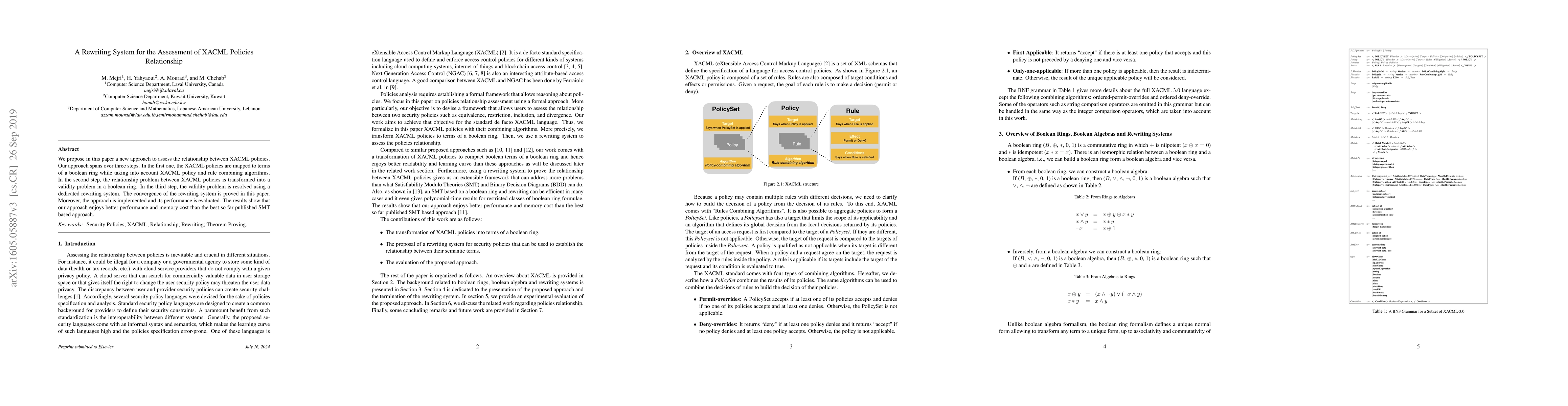 This paper proposes a three-step approach to assess relationships between XACML policies, mapping them to a boolean ring, transforming the relationship problem into a validity problem, and resolving it using a dedicated rewriting system. The approach demonstrates superior performance and lower memory cost compared to existing SMT-based methods.