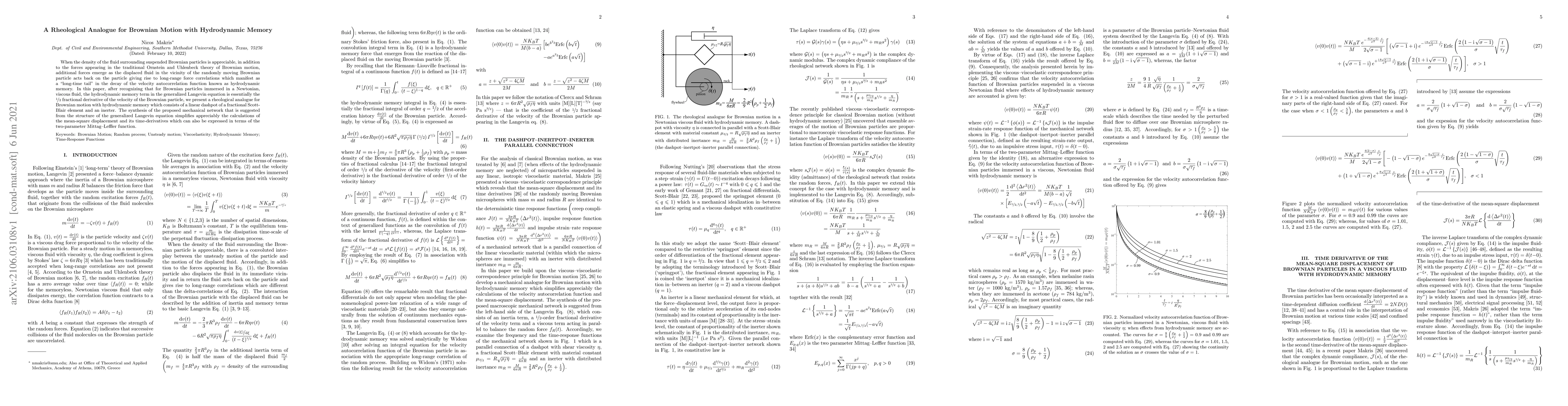 When the density of the fluid surrounding suspended Brownian particles is appreciable, in addition to the forces appearing in the traditional Ornstein and Uhlenbeck theory of Brownian motion, additional forces emerge as the displaced fluid in the vicinity of the randomly moving Brownian particle acts back on the particle giving rise to long-range force correlations which manifest as a ``long-time tail'' in the decay of the velocity autocorrelation function known as hydrodynamic memory. In this paper, after recognizing that for Brownian particles immersed in a Newtonian, viscous fluid, the hydrodynamic memory term in the generalized Langevin equation is essentially the 1/2 fractional derivative of the velocity of the Brownian particle, we present a rheological analogue for Brownian motion with hydrodynamic memory which consists of a linear dashpot of a fractional Scott-Blair element and an inerter. The synthesis of the proposed mechanical network that is suggested from the structure of the generalized Langevin equation simplifies appreciably the calculations of the mean-square displacement and its time-derivatives which can also be expressed in terms of the two-parameter Mittag--Leffler function.