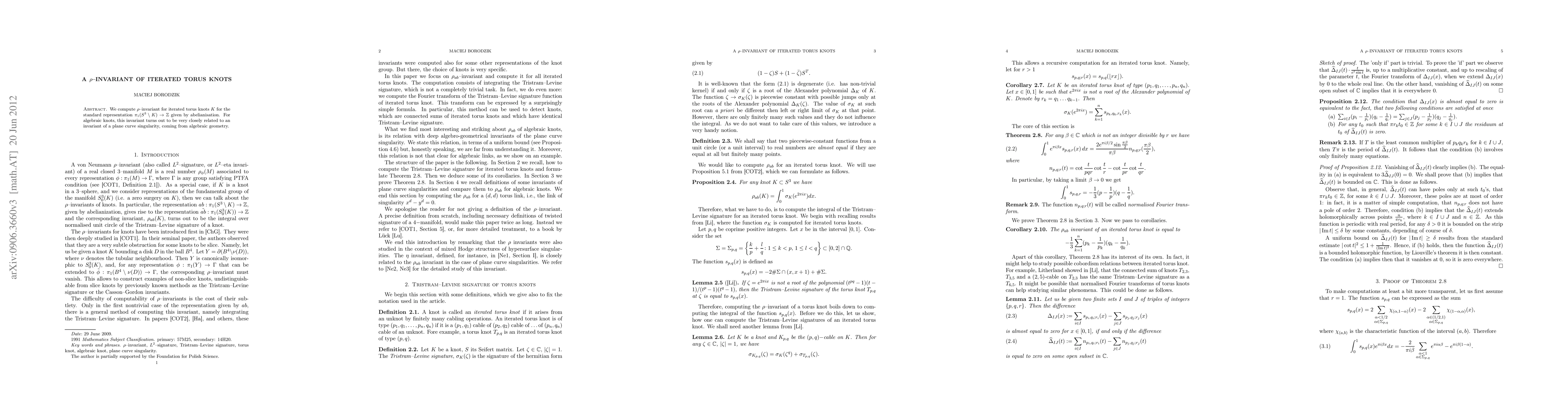 This paper computes the rho-invariant for iterated torus knots under the standard abelian representation, revealing a strong connection to invariants of plane curve singularities derived from algebraic geometry. The findings highlight the interplay between knot theory and algebraic geometry.