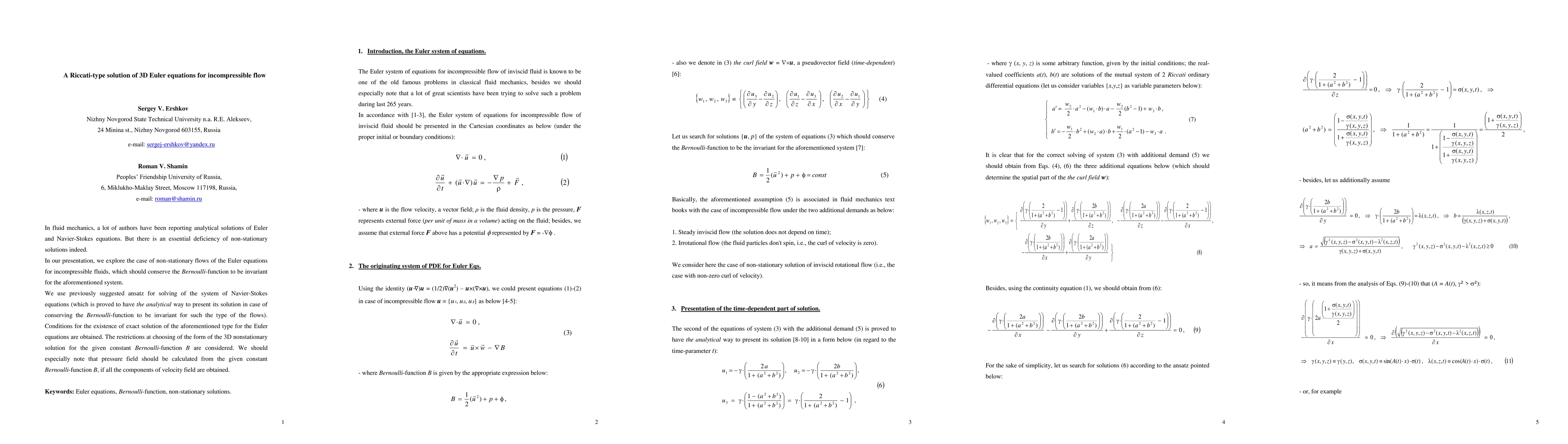This paper presents an analytical solution for non-stationary 3D Euler equations of incompressible fluid flow using a Riccati-type approach. It explores conditions for the existence of exact solutions that conserve the Bernoulli function and discusses the calculation of the pressure field from the given constant Bernoulli function.