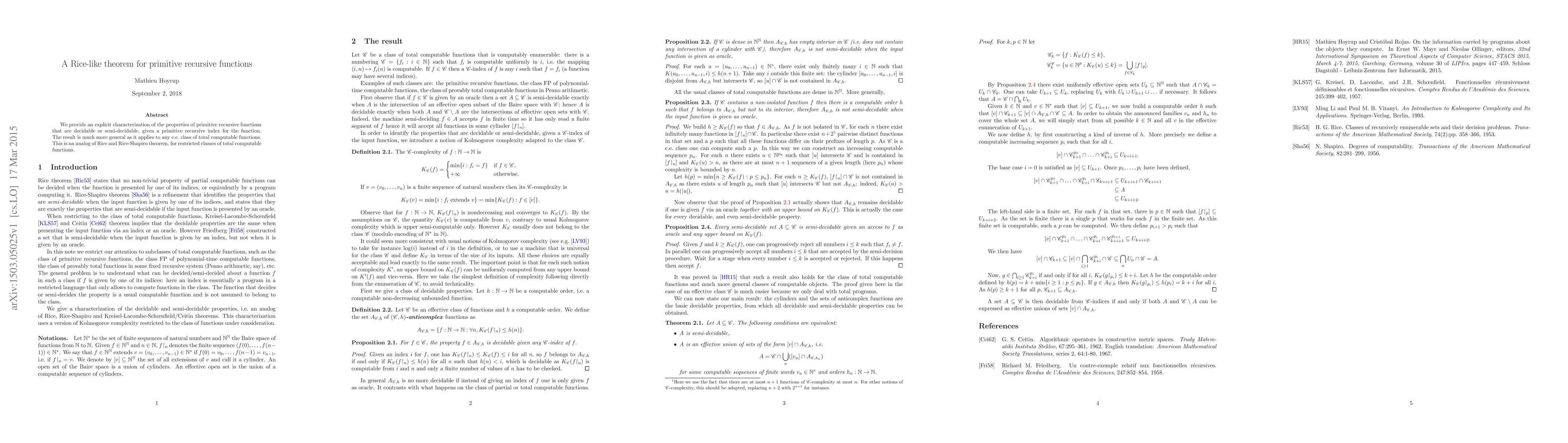 This paper characterizes decidability and semi-decidability for properties of primitive recursive functions using their indices, extending the Rice-Shapiro theorem to any c.e. class of total computable functions. The result provides a Rice-like theorem specifically for primitive recursive functions.
