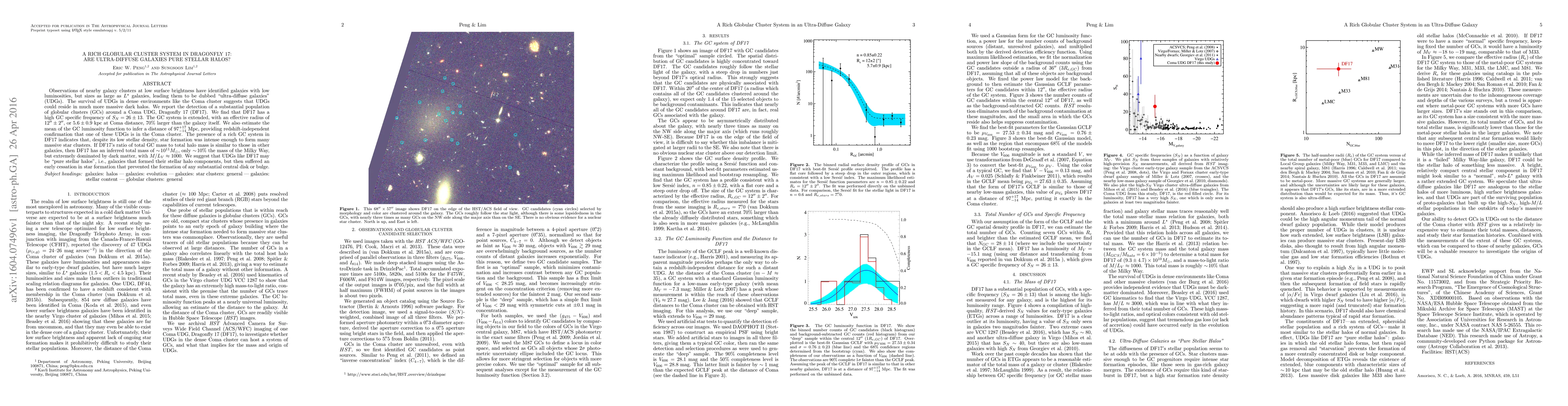This paper reports the discovery of a rich globular cluster system around the ultra-diffuse galaxy Dragonfly 17, suggesting it may have a dark matter halo mass of ~10^11 solar masses, implying UDGs could be "pure stellar halos" with minimal star formation after initial formation.