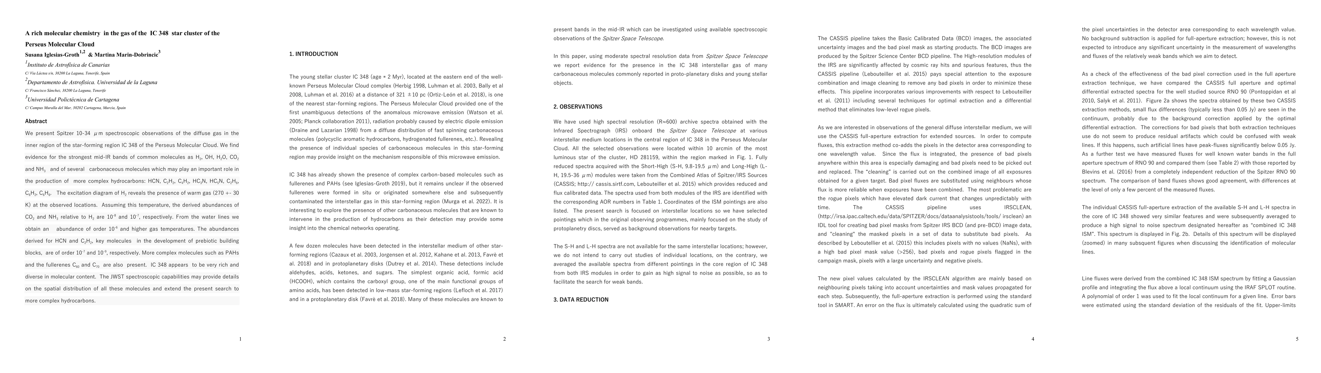 We present Spitzer 10-34 {\mu}m spectroscopic observations of the diffuse gas in the inner region of the star-forming region IC 348 of the Perseus Molecular Cloud. We find evidence for the strongest mid-IR bands of common molecules as H\textsubscript{2}, OH, H\textsubscript{2}O,CO\textsubscript{2} and NH\textsubscript{3} and of several carbonaceous molecules which may play an important role in the production of more complex hydrocarbons: HCN, C\textsubscript{2}H\textsubscript{2}, C\textsubscript{4}H\textsubscript{2}, HC\textsubscript{3}N, HC\textsubscript{5}N, C\textsubscript{2}H\textsubscript{6}, C\textsubscript{6}H\textsubscript{2}, C\textsubscript{6}H\textsubscript{6}. The excitation diagram of H\textsubscript{2} reveals the presence of warm gas (270 +- 30 K) at the observed locations. Assuming this temperature, the derived abundances of CO\textsubscript{2} and NH\textsubscript{3} relative to H\textsubscript{2} are 10\textsuperscript{-8} and 10\textsuperscript{-7}, respectively. From the water lines we obtain an abundance of order 10\textsuperscript{-6} and higher gas temperatures. The abundances derived for HCN and C\textsubscript{2}H\textsubscript{2}, key molecules in the development of prebiotic building blocks, are of order 10\textsuperscript{-7} and 10\textsuperscript{-9}, respectively. More complex molecules such as PAHs and the fullerenes C\textsubscript{60} and C\textsubscript{70} are also present. IC 348 appears to be very rich and diverse in molecular content. The JWST spectroscopic capabilities may provide details on the spatial distribution of all these molecules and extend the present search to more complex hydrocarbons.