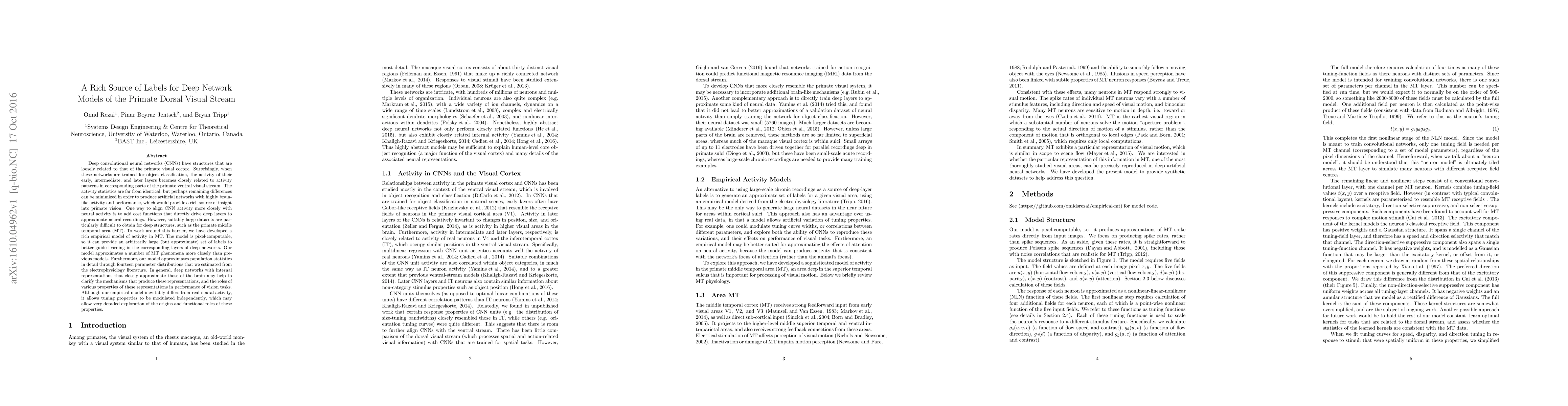 This paper develops an empirical model to simulate the activity of the primate middle temporal area (MT) to provide labels for training deep convolutional neural networks. The model aims to align CNN activity with neural recordings, offering insights into the mechanisms of primate vision and the functional roles of neural representations.