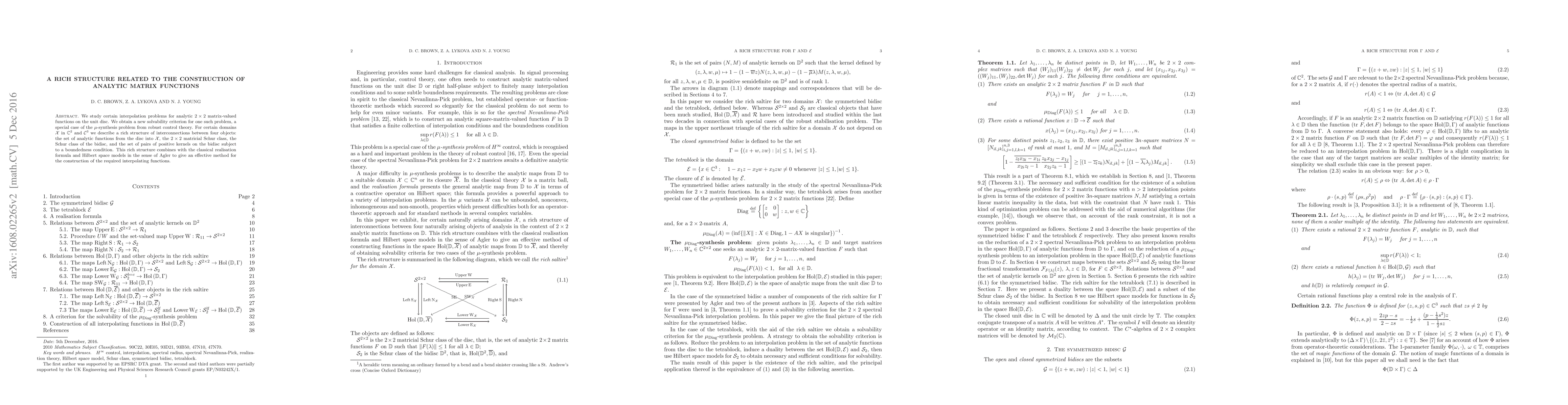 We analyse two special cases of $\mu$-synthesis problems which can be reduced to interpolation problems in the set of analytic functions from the disc into the symmetrised bidisc and into the tetrablock. For these inhomogeneous domains we study the structure of interconnections between the set of analytic functions from the disc into the given domain, the matricial Schur class, the Schur class of the bidisc, and the set of pairs of positive kernels on the bidisc subject to a boundedness condition. We use the theories of Hilbert function spaces and of reproducing kernels to establish these connections. We give a solvability criterion for the interpolation problem that arises from the $\mu$-synthesis problem related to the tetrablock.