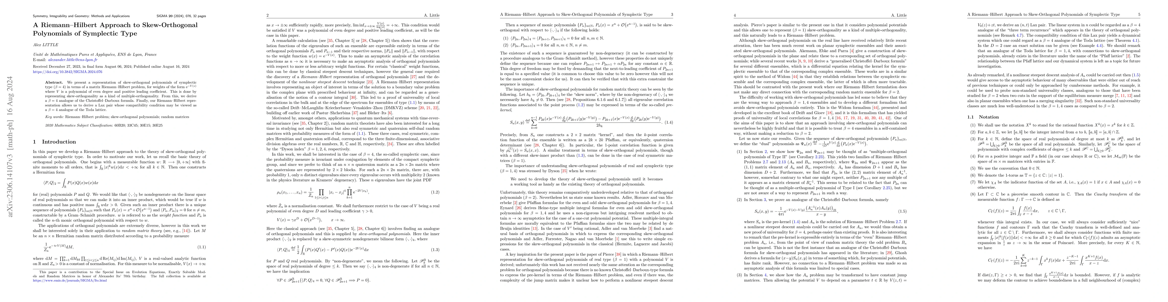 This paper uses a Riemann-Hilbert approach to represent skew-orthogonal polynomials of symplectic type ($\beta = 4$) by framing skew-orthogonality as multiple-orthogonality, deriving a $\beta = 4$ analogue of the Christoffel-Darboux formula, and establishing a Lax pair resembling the Toda lattice.