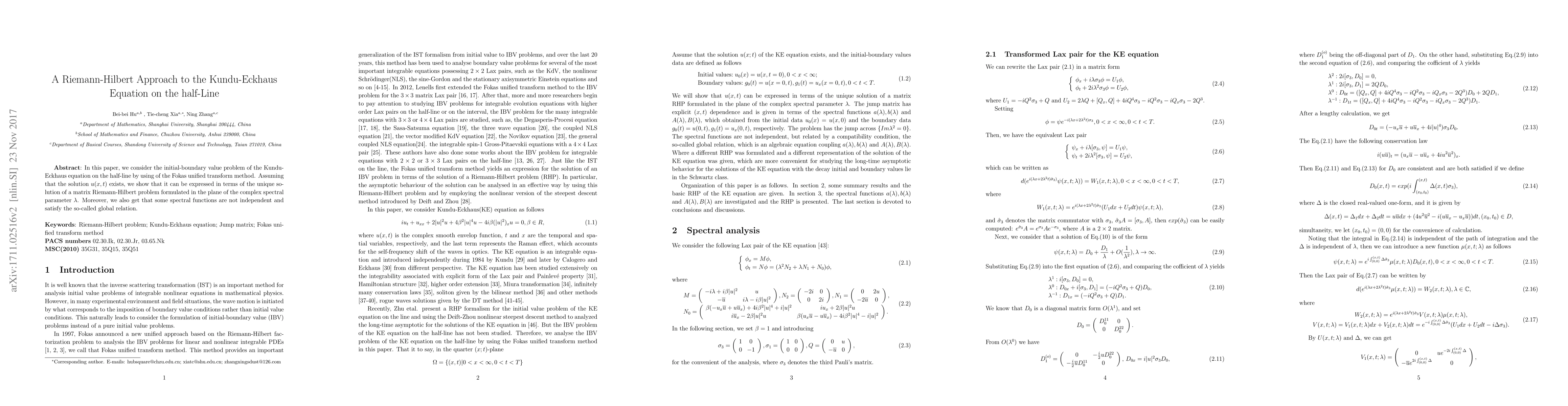In this paper, we consider the initial-boundary value problem of the Kundu-Eckhaus equation on the half-line by using of the Fokas unified transform method. Assuming that the solution $u(x,t)$ exists, we show that it can be expressed in terms of the unique solution of a matrix Riemann-Hilbert problem formulated in the plane of the complex spectral parameter $\lambda$. Moreover, we also get there exist spectral functions are not independent and they are satisfying the so-called global relation.
