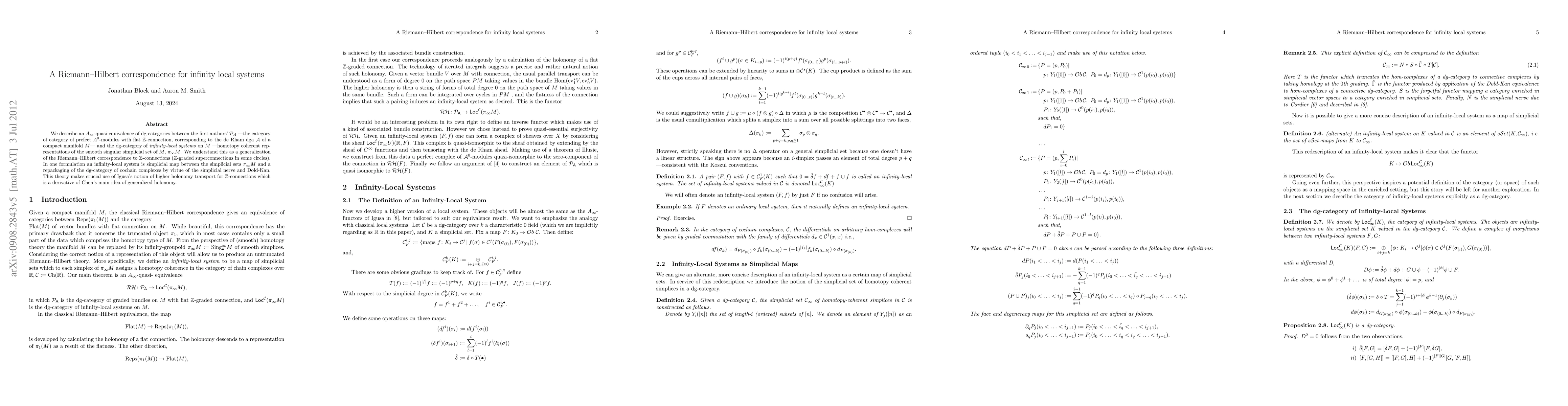 We describe an $A_\infty$-quasi-equivalence of dg-categories between the first authors' $\mathcal{P}_{\mathcal{A}}$ ---the category of category of prefect $A^0$-modules with flat $\Z$-connection, corresponding to the de Rham dga $\mathcal{A}$ of a compact manifold $M$--- and the dg-category of \emph{infinity-local systems} on $M$ ---homotopy coherent representations of the smooth singular simplicial set of $M$, $\Pinf$. We understand this as a generalization of the Riemann--Hilbert correspondence to $\Z$-connections ($\Z$-graded superconnections in some circles). In one formulation an infinity-local system is simplicial map between the simplicial sets ${\pi}_{\infty}M$ and a repackaging of the dg-category of cochain complexes by virtue of the simplicial nerve and Dold-Kan. This theory makes crucial use of Igusa's notion of higher holonomy transport for $\Z$-connections which is a derivative of Chen's main idea of generalized holonomy.