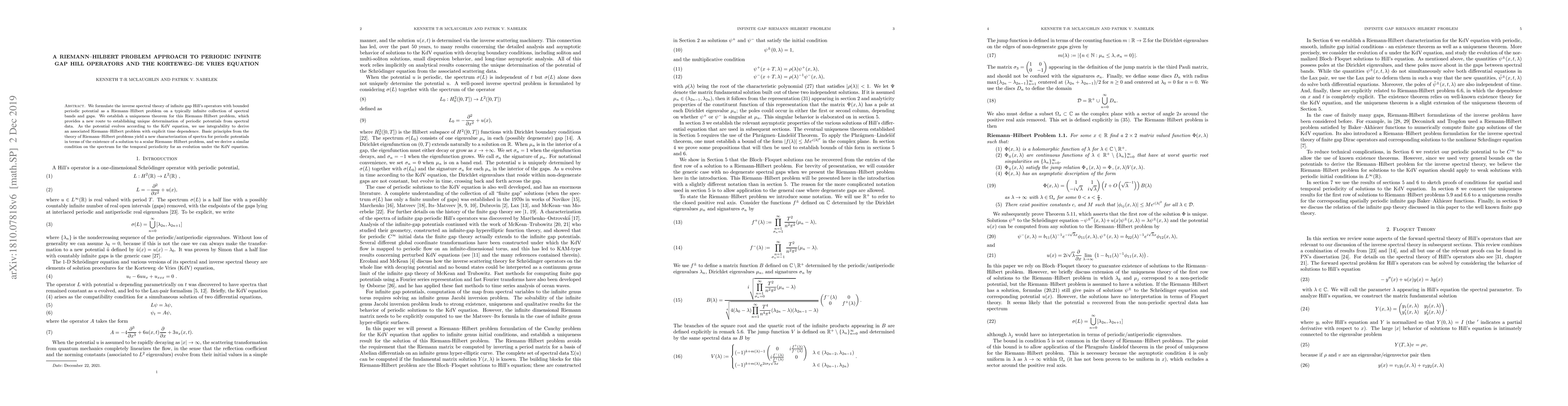 This paper formulates the inverse spectral theory for periodic infinite gap Hill's operators using Riemann-Hilbert problems, establishing a uniqueness theorem for the potentials. It also links the evolution of these potentials under the KdV equation to a Riemann-Hilbert problem with time dependence, providing a new method for determining periodic potentials from spectral data.