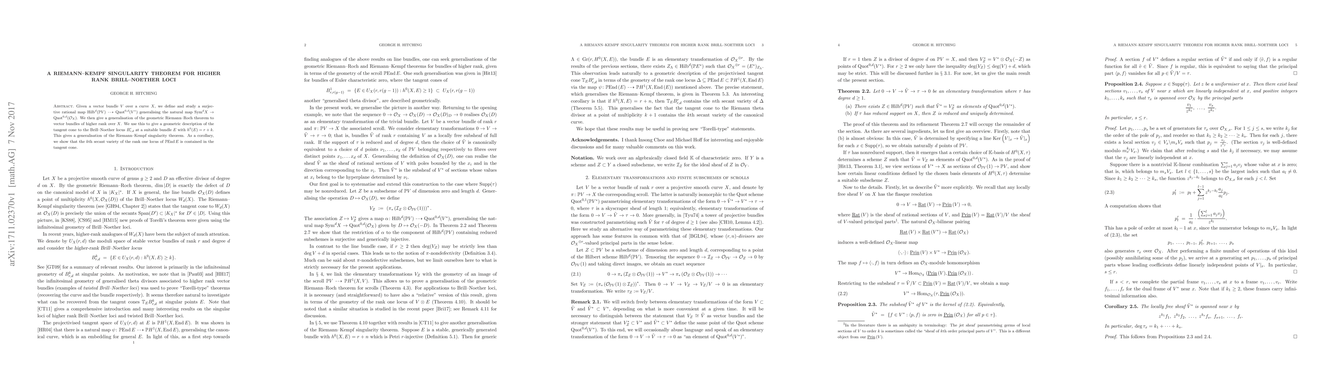 Given a vector bundle $V$ over a curve $X$, we define and study a surjective rational map $\mathrm{Hilb}^d (\mathbb{P} V ) - \mathrm{Quot}^{0, d} ( V^* )$ generalising the natural map $\mathrm{Sym}^d X \to \mathrm{Quot}^{0, d} ({\mathcal O}_X)$. We then give a generalisation of the geometric Riemann--Roch theorem to vector bundles of higher rank over $X$. We use this to give a geometric description of the tangent cone to the Brill--Noether locus $B^r_{r, d}$ at a suitable bundle $E$ with $h^0 (E) = r+n$. This gives a generalisation of the Riemann--Kempf singularity theorem. As a corollary, we show that the $n$th secant variety of the rank one locus of $\mathbb{P} \mathrm{End} E$ is contained in the tangent cone.