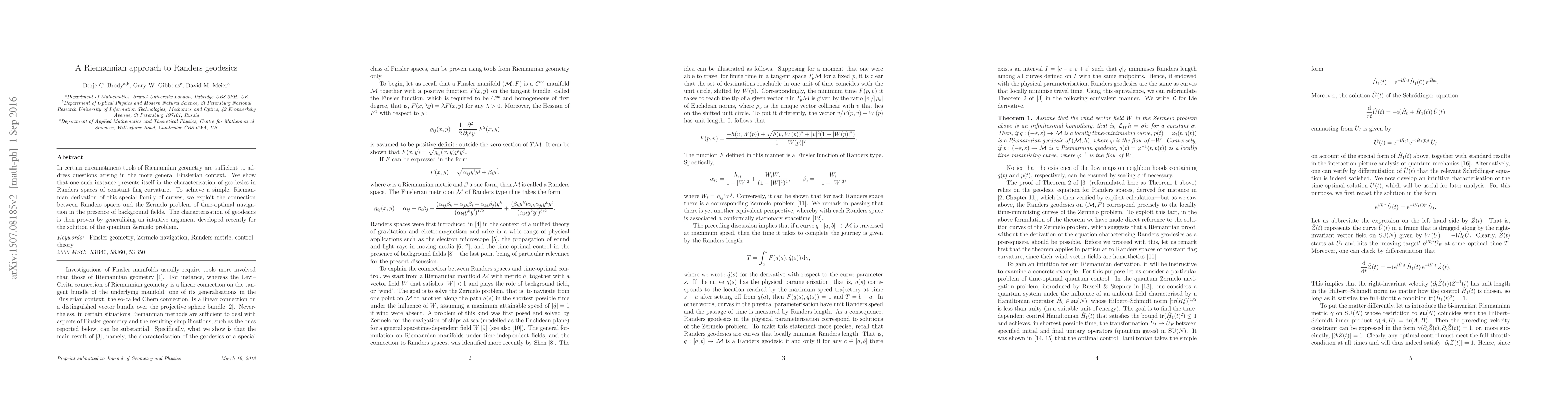 In certain circumstances tools of Riemannian geometry are sufficient to address questions arising in the more general Finslerian context. We show that one such instance presents itself in the characterisation of geodesics in Randers spaces of constant flag curvature. To achieve a simple, Riemannian derivation of this special family of curves, we exploit the connection between Randers spaces and the Zermelo problem of time-optimal navigation in the presence of background fields. The characterisation of geodesics is then proven by generalising an intuitive argument developed recently for the solution of the quantum Zermelo problem.