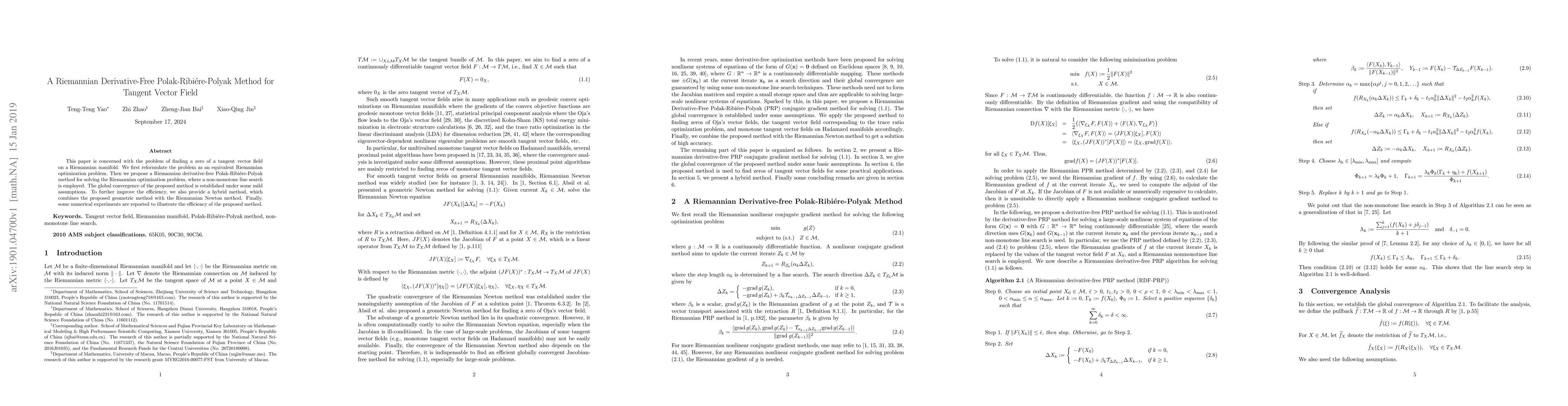 This paper is concerned with the problem of finding a zero of a tangent vector field on a Riemannian manifold. We first reformulate the problem as an equivalent Riemannian optimization problem. Then we propose a Riemannian derivative-free Polak-Ribi\'ere-Polyak method for solving the Riemannian optimization problem, where a non-monotone line search is employed. The global convergence of the proposed method is established under some mild assumptions. To further improve the efficiency, we also provide a hybrid method, which combines the proposed geometric method with the Riemannian Newton method. Finally, some numerical experiments are reported to illustrate the efficiency of the proposed method.