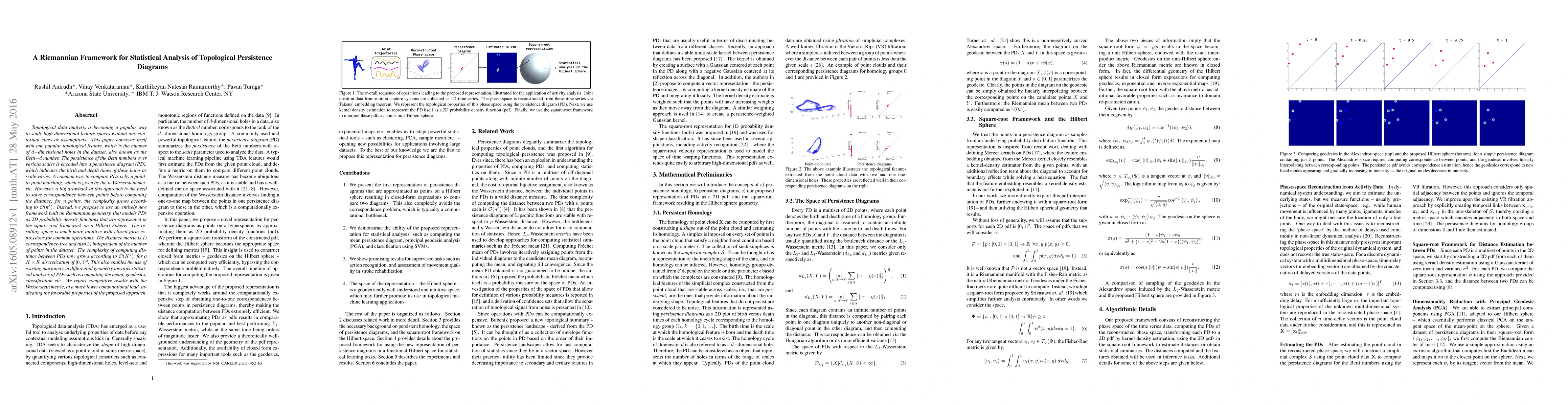 This paper proposes a Riemannian framework for analyzing topological persistence diagrams (PDs) by modeling them as 2D probability density functions on a Hilbert Sphere. This approach offers a correspondence-free distance metric with $\mathcal{O}(K^2)$ complexity compared to the $\mathcal{O}(n^3)$ complexity of the $n$-Wasserstein metric, enabling efficient statistical analysis and competitive results.