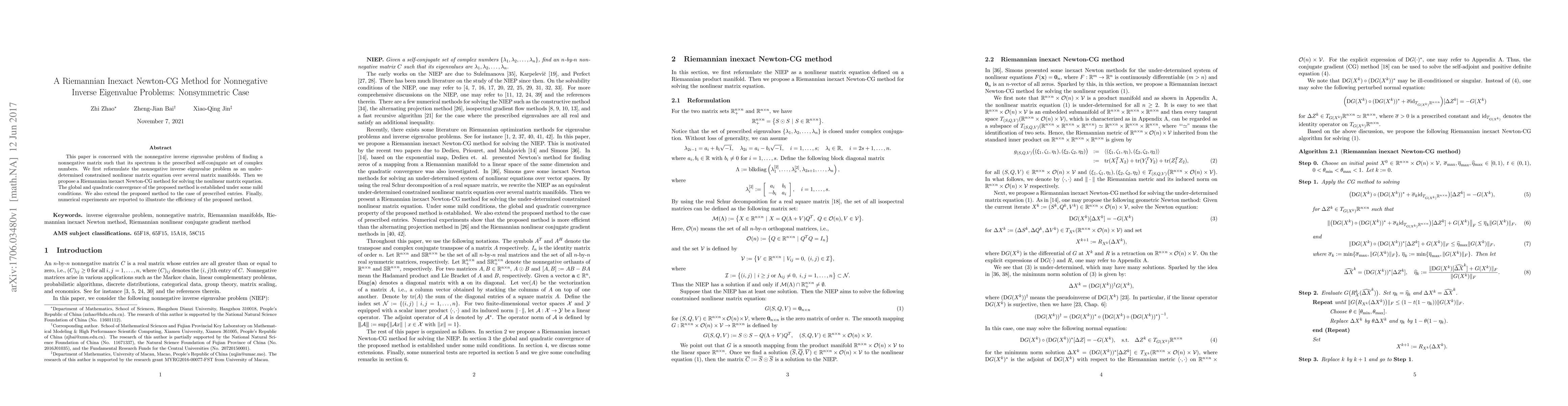 This paper is concerned with the nonnegative inverse eigenvalue problem of finding a nonnegative matrix such that its spectrum is the prescribed self-conjugate set of complex numbers. We first reformulate the nonnegative inverse eigenvalue problem as an under-determined constrained nonlinear matrix equation over several matrix manifolds. Then we propose a Riemannian inexact Newton-CG method for solving the nonlinear matrix equation. The global and quadratic convergence of the proposed method is established under some mild conditions. We also extend the proposed method to the case of prescribed entries. Finally, numerical experiments are reported to illustrate the efficiency of the proposed method.
