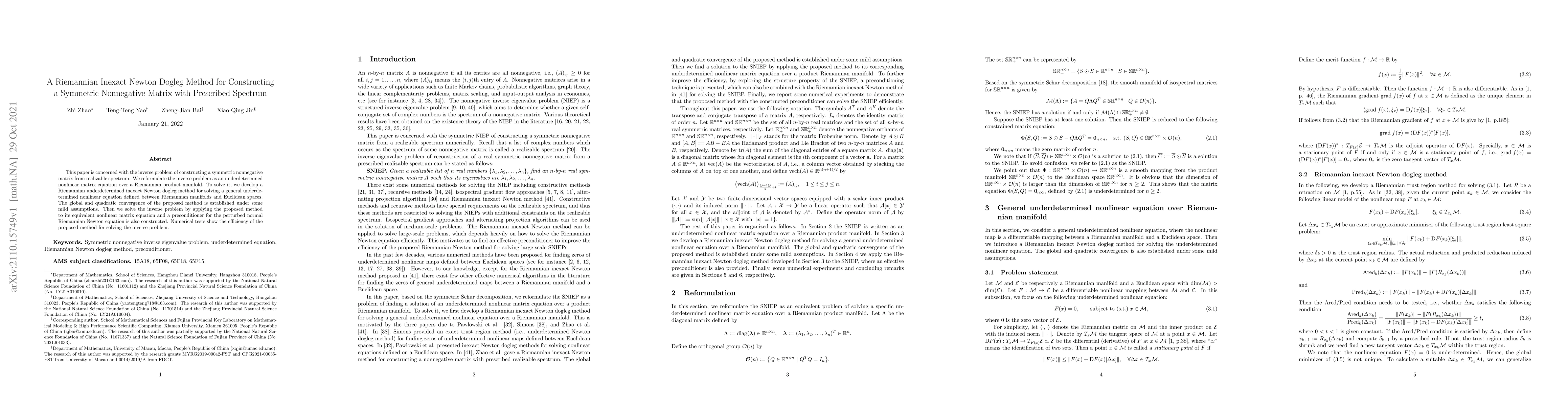 This paper proposes a Riemannian inexact Newton dogleg method to solve the inverse problem of constructing a symmetric nonnegative matrix with a prescribed spectrum. The method ensures global and quadratic convergence and is demonstrated to be effective through numerical tests.
