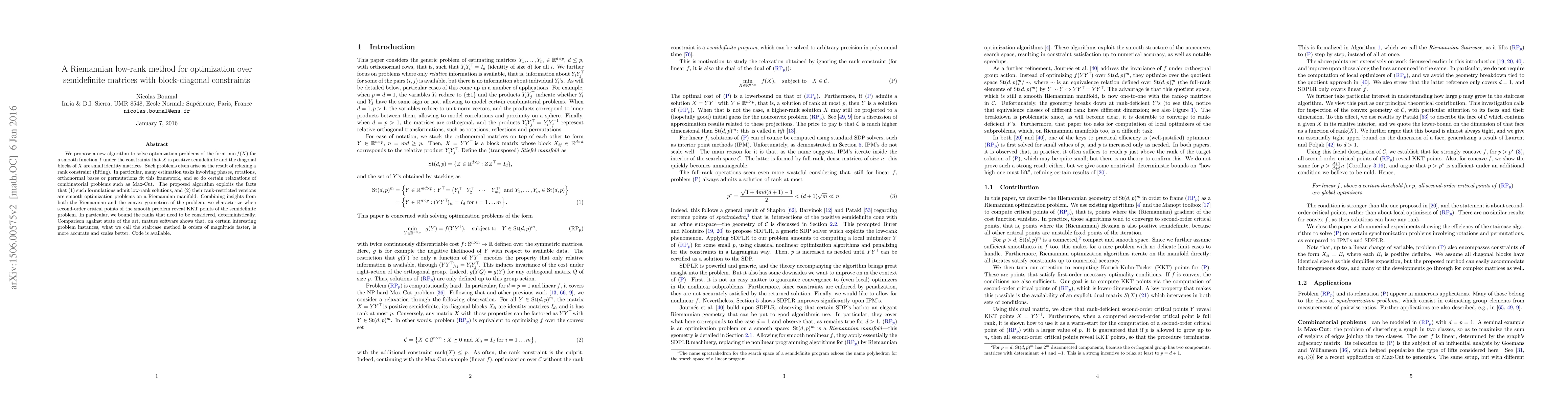 This paper introduces a Riemannian low-rank optimization algorithm for solving semidefinite matrix problems with block-diagonal constraints, demonstrating its efficiency and accuracy over existing methods, especially for tasks involving phases, rotations, and combinatorial relaxations. The proposed staircase method scales better and is significantly faster for certain problem instances.