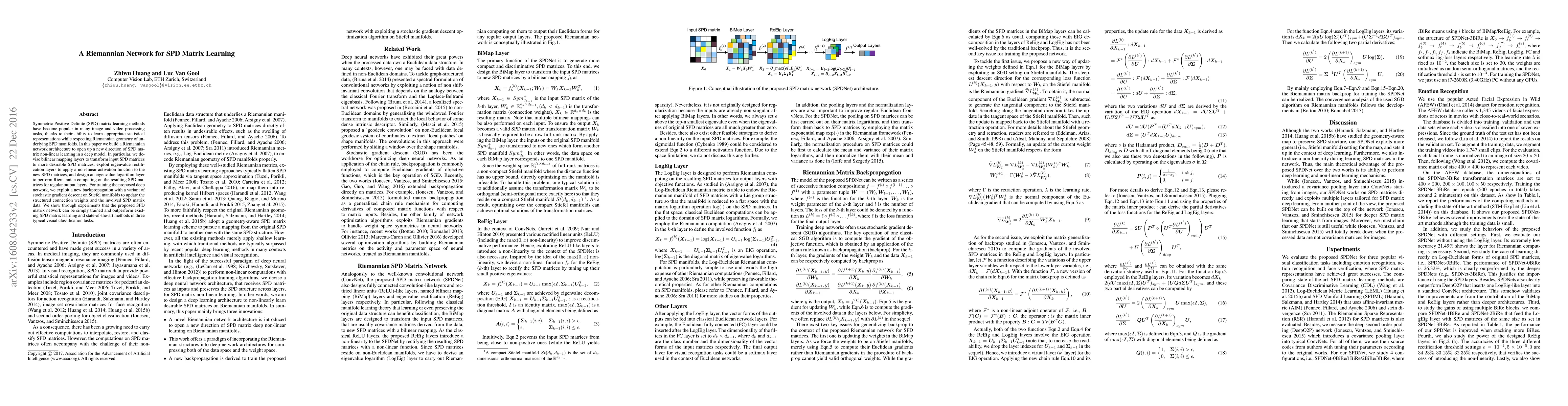 This paper introduces a Riemannian network architecture for learning Symmetric Positive Definite (SPD) matrices, utilizing bilinear, eigenvalue rectification, and logarithm layers to respect SPD geometry. The network is trained using a novel backpropagation method on Stiefel manifolds, demonstrating superior performance in visual classification tasks compared to existing methods.