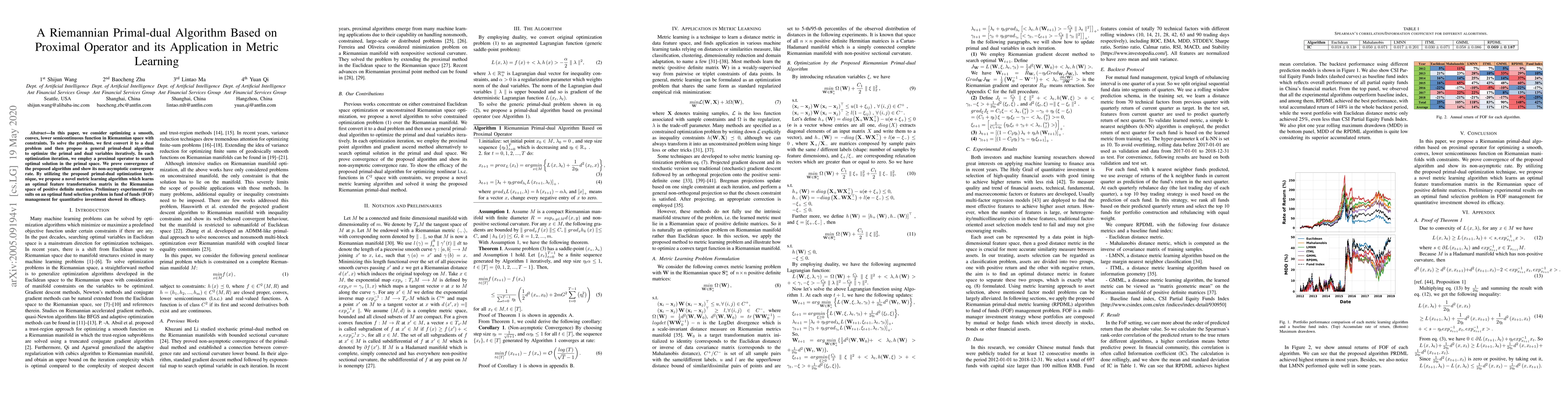 This paper proposes a Riemannian primal-dual algorithm using a proximal operator for optimizing smooth, convex functions in Riemannian space. It demonstrates convergence and non-asymptotic convergence rate, and applies the method to develop a novel metric learning algorithm for optimal feature transformation in positive definite matrix space, showing effectiveness in fund selection for quantitative investment.