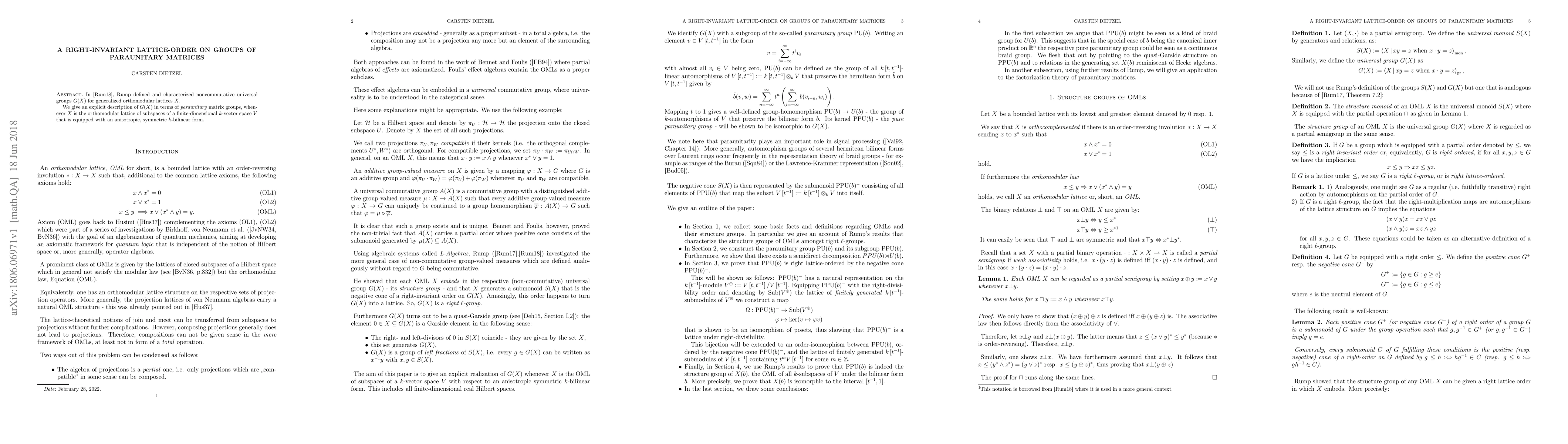 This paper provides an explicit description of Rump's noncommutative universal groups $G(X)$ in terms of paraunitary matrix groups, focusing on the orthomodular lattice of subspaces of a finite-dimensional vector space equipped with an anisotropic, symmetric bilinear form. The study establishes a right-invariant lattice-order on these groups.