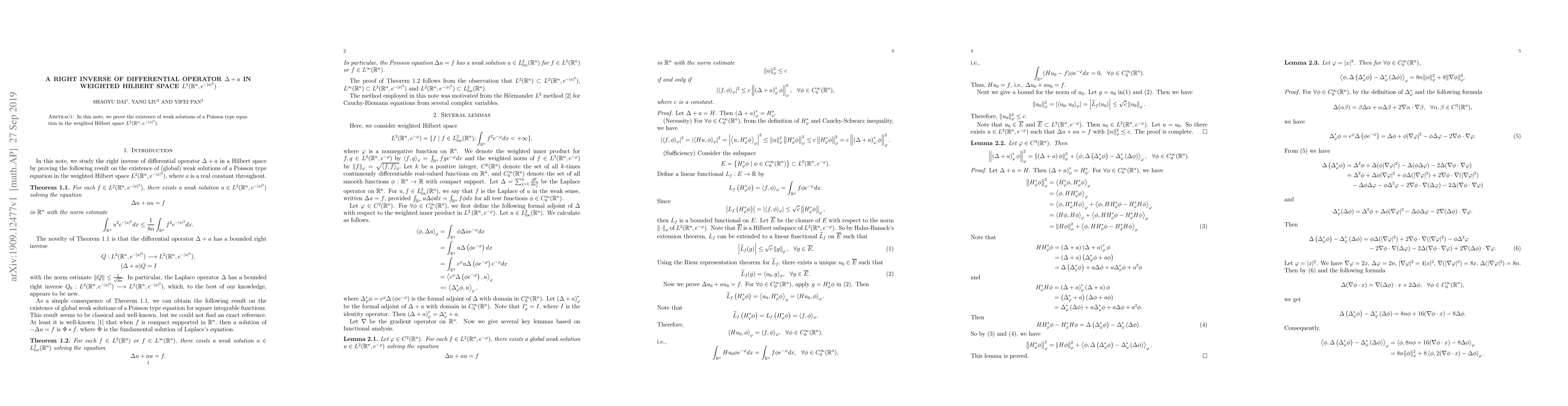 Summary: This paper proves the existence of weak solutions for a Poisson type equation using a right inverse of the differential operator $\Delta+a$ in the weighted Hilbert space $L^2(\mathbb{R}^n,e^{-|x|^2})$. The study focuses on the analytical framework within this specific weighted space.