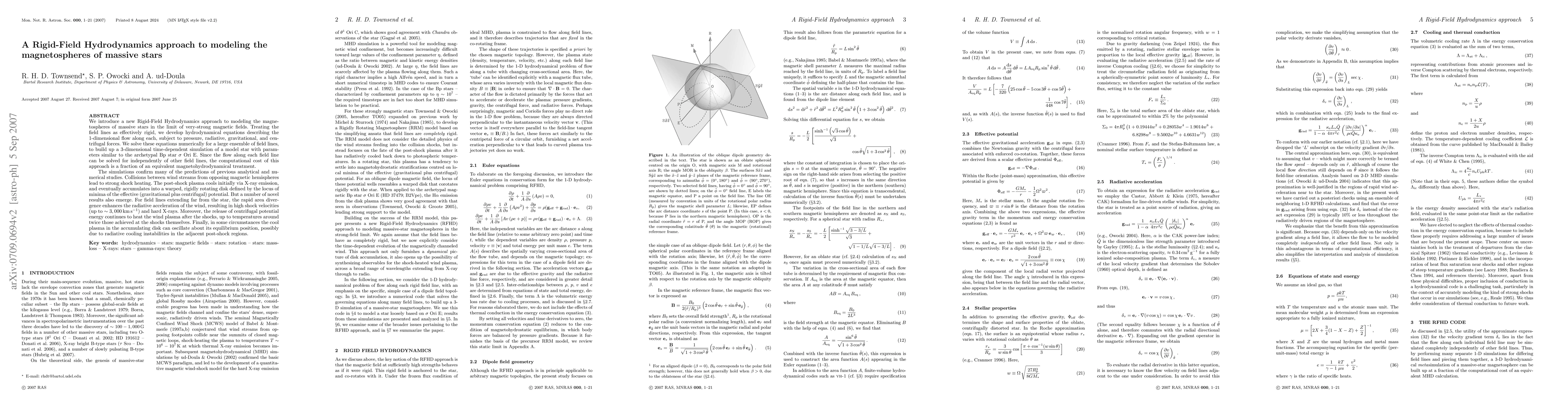 We introduce a new Rigid-Field Hydrodynamics approach to modeling the magnetospheres of massive stars in the limit of very-strong magnetic fields. Treating the field lines as effectively rigid, we develop hydrodynamical equations describing the 1-dimensional flow along each, subject to pressure, radiative, gravitational, and centrifugal forces. We solve these equations numerically for a large ensemble of field lines, to build up a 3-dimensional time-dependent simulation of a model star with parameters similar to the archetypal Bp star sigma Ori E. Since the flow along each field line can be solved for independently of other field lines, the computational cost of this approach is a fraction of an equivalent magnetohydrodynamical treatment. The simulations confirm many of the predictions of previous analytical and numerical studies. Collisions between wind streams from opposing magnetic hemispheres lead to strong shock heating. The post-shock plasma cools initially via X-ray emission, and eventually accumulates into a warped, rigidly rotating disk defined by the locus of minima of the effective (gravitational plus centrifugal) potential. But a number of novel results also emerge. For field lines extending far from the star, the rapid area divergence enhances the radiative acceleration of the wind, resulting in high shock velocities (up to ~3,000 km/s) and hard X-rays. Moreover, the release of centrifugal potential energy continues to heat the wind plasma after the shocks, up to temperatures around twice those achieved at the shocks themselves. Finally, in some circumstances the cool plasma in the accumulating disk can oscillate about its equilibrium position, possibly due to radiative cooling instabilities in the adjacent post-shock regions.