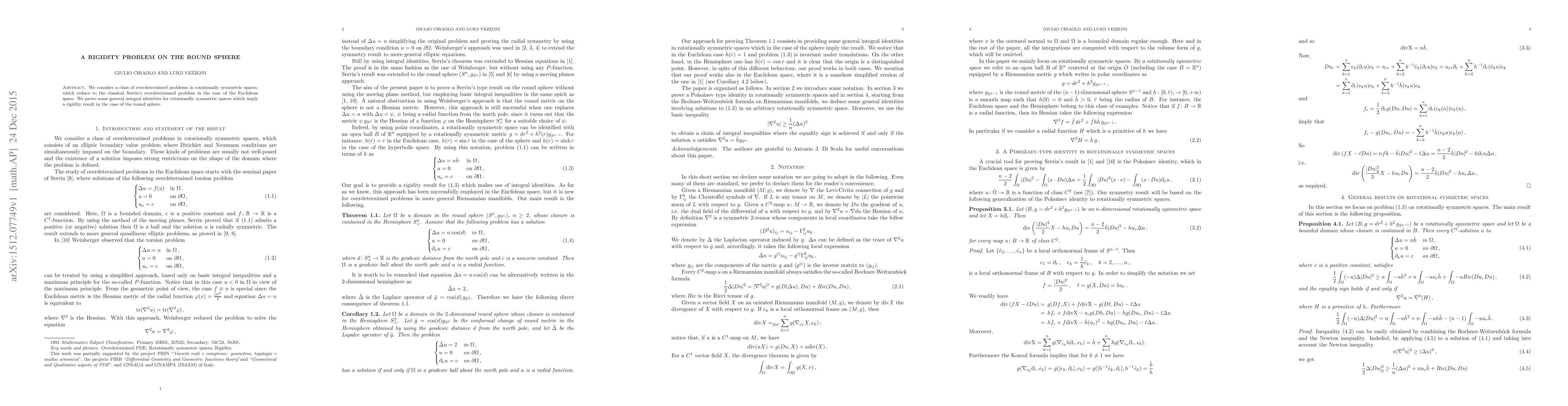 This paper proves integral identities for rotationally symmetric spaces, showing a rigidity result for overdetermined problems on the round sphere, extending classical results from Euclidean space.