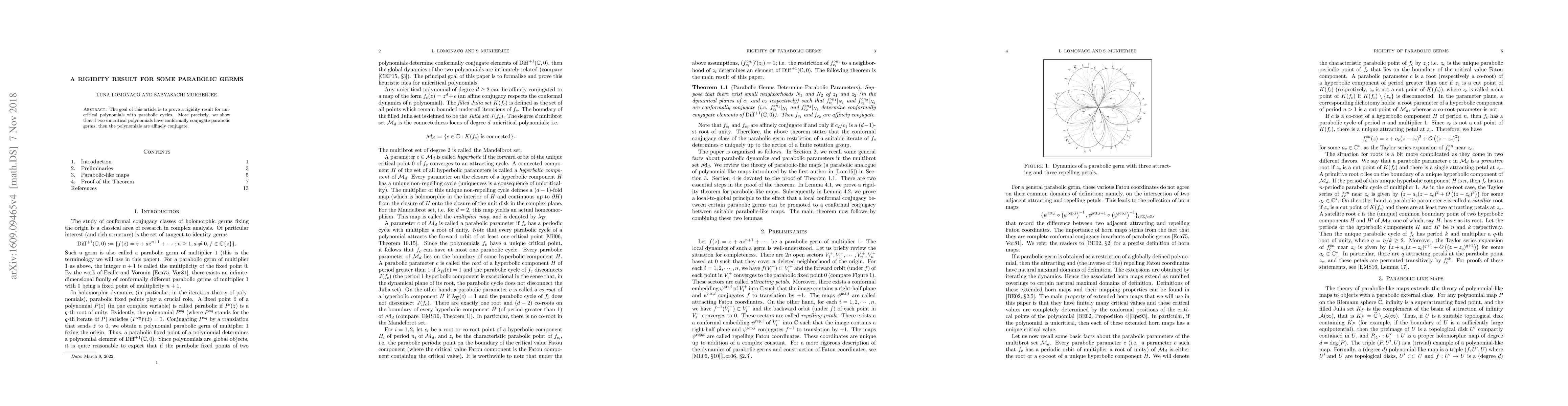 This paper proves that if two unicritical polynomials have conformally conjugate parabolic germs, then they are affinely conjugate, showing a rigidity result for certain polynomials with parabolic cycles.