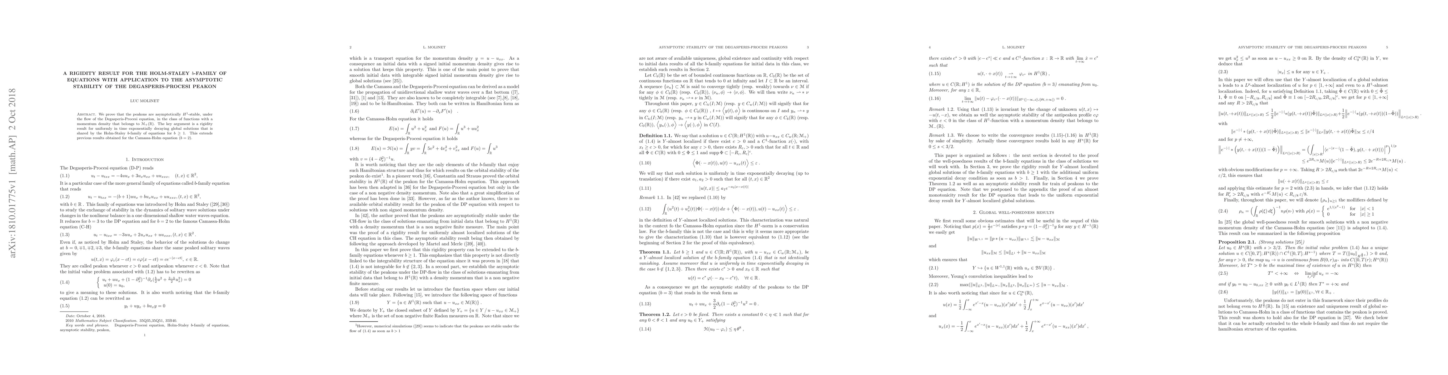 We prove that the peakons are asymptotically H 1-stable, under the flow of the Degasperis-Procesi equation, in the class of functions with a momentum density that belongs to M + (R). The key argument is a rigidity result for uniformly in time exponentially decaying global solutions that is shared by the Holm-Staley b-family of equations for b $\ge$ 1. This extends previous results obtained for the Camassa-Holm equation (b = 2).