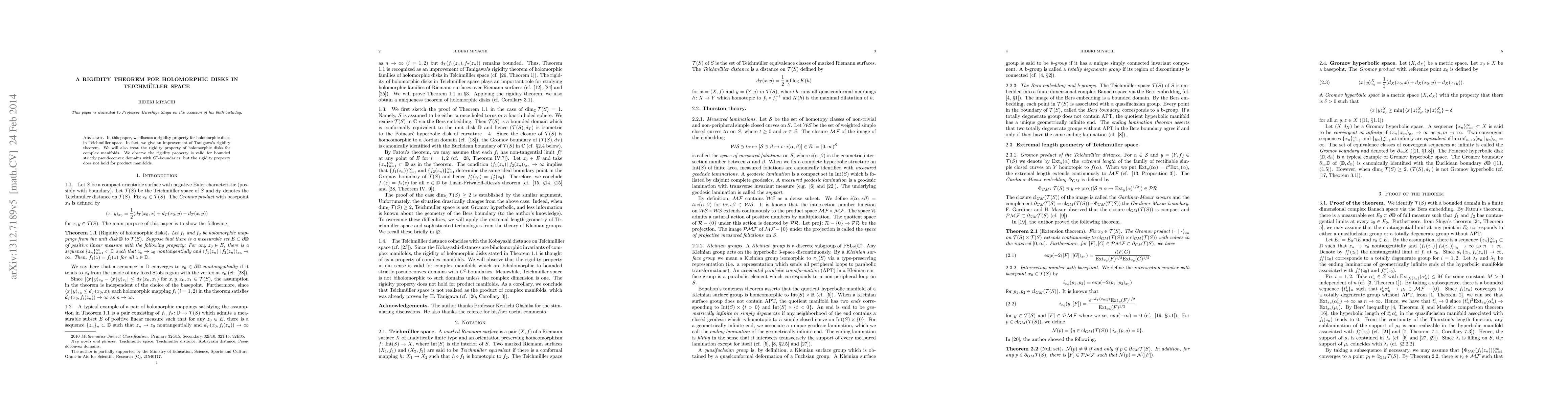 In this paper, we discuss a rigidity property for holomorphic disks in Teichm\"uller space. In fact, we give a refinement of Tanigawa's rigidity theorem. We will also treat the rigidity property of holomorphic disks for complex manifolds. We observe the rigidity property is valid for bounded strictly pseudoconvex domains with $C^{2}$-boundaries, but the rigidity property does not hold for product manifolds.