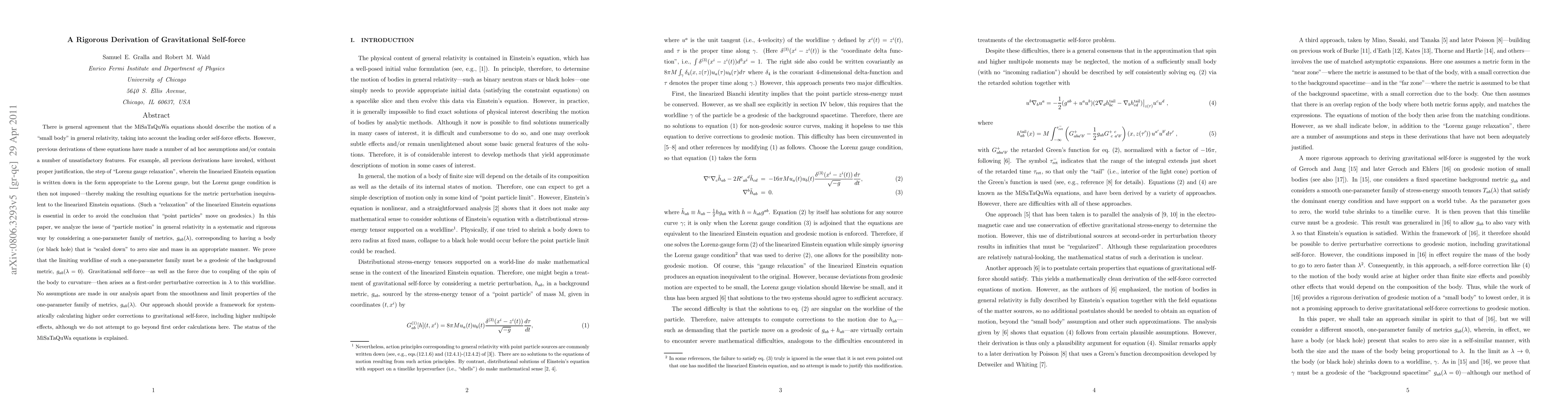 This paper rigorously derives the MiSaTaQuWa equations for gravitational self-force in general relativity, systematically addressing previous ad hoc assumptions by considering a one-parameter family of metrics. The analysis shows that the limiting worldline is a geodesic, with self-force arising as a first-order correction.
