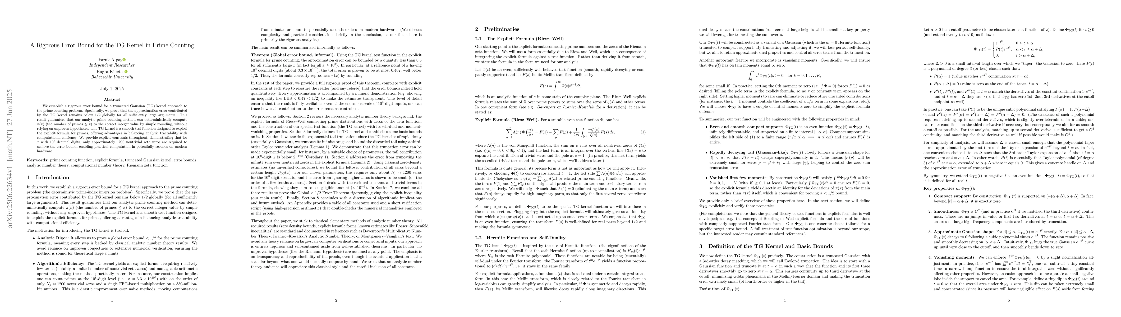 This research rigorously proves that using a truncated Gaussian kernel in prime counting maintains an error below 1/2 for large arguments, enabling precise computation of prime numbers through straightforward rounding. The method requires only about 1200 nontrivial zeta zeros for x with 10^8 digits, improving computational efficiency significantly compared to classical methods. It combines analytic number theory with practical computation, providing explicit tail and zero-sum error bounds, and suggesting potential for optimized kernel designs and deeper insights into prime distribution.