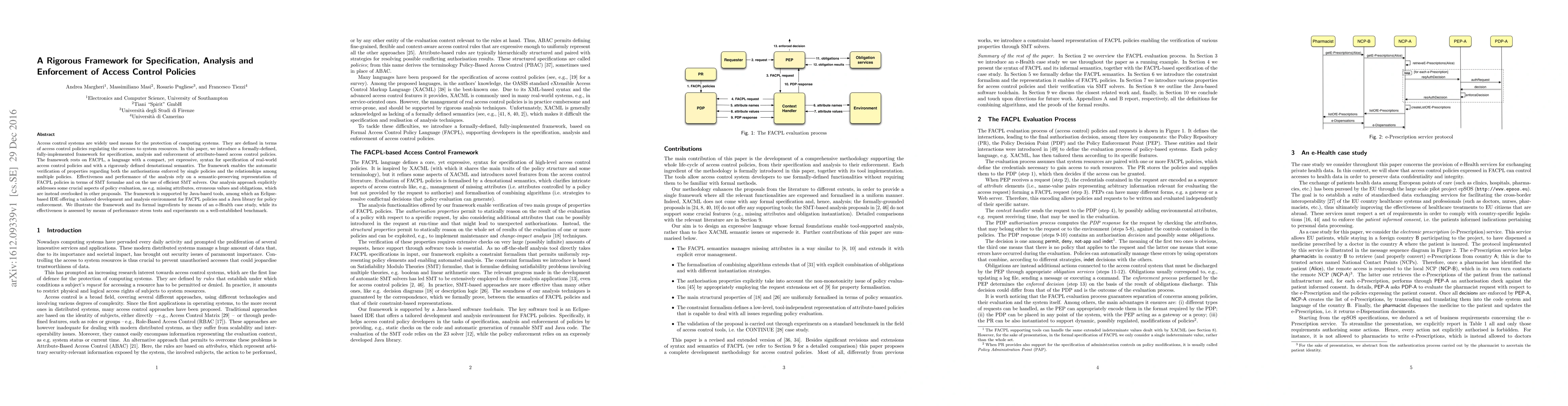 This paper presents a rigorous framework for specifying, analyzing, and enforcing attribute-based access control policies using FACPL, a language with expressive syntax and denotational semantics. The framework leverages SMT solvers for efficient verification and addresses issues like missing attributes and obligations, supported by Java tools including an Eclipse IDE and a policy enforcement library.