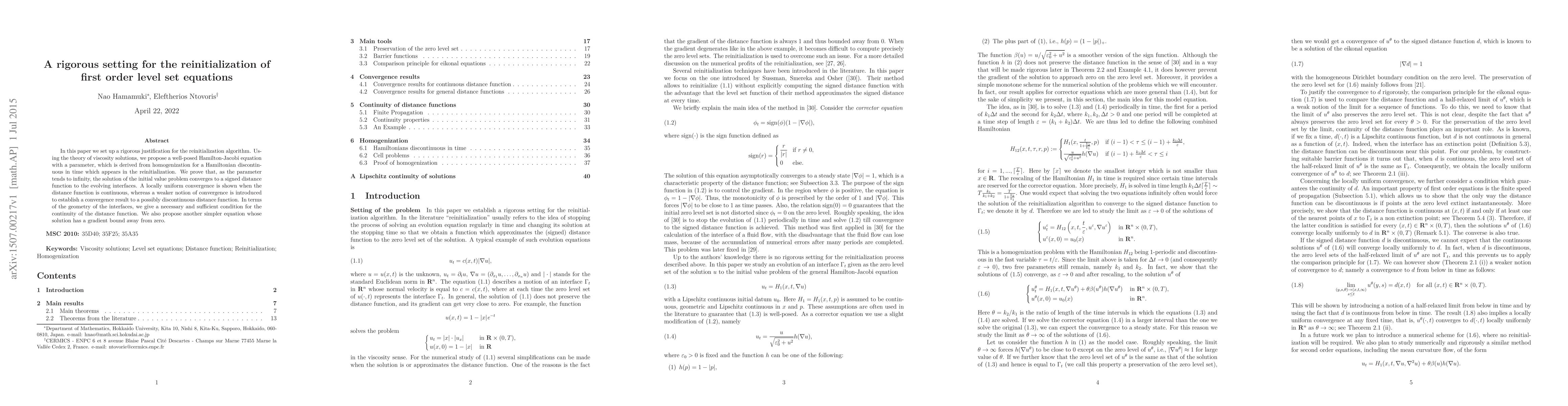 This paper rigorously justifies the reinitialization algorithm for first-order level set equations by proposing a well-posed Hamilton-Jacobi equation derived from homogenization. It demonstrates convergence to a signed distance function for evolving interfaces, establishing locally uniform convergence under continuity conditions.
