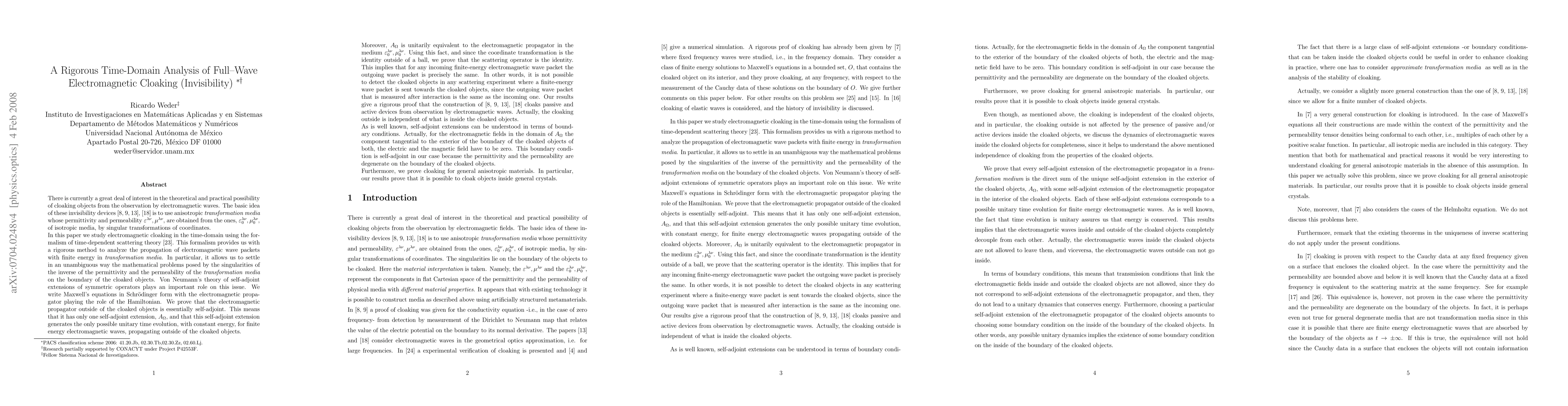 There is currently a great deal of interest in the theoretical and practical possibility of cloaking objects from the observation by electromagnetic waves. The basic idea of these invisibility devices \cite{glu1, glu2, le},\cite{pss1} is to use anisotropic {\it transformation media} whose permittivity and permeability $\var^{\lambda\nu}, \mu^{\lambda\nu}$, are obtained from the ones, $\var_0^{\lambda\nu}, \mu^{\lambda\nu}_0$, of isotropic media, by singular transformations of coordinates. In this paper we study electromagnetic cloaking in the time-domain using the formalism of time-dependent scattering theory. This formalism allows us to settle in an unambiguous way the mathematical problems posed by the singularities of the inverse of the permittivity and the permeability of the {\it transformation media} on the boundary of the cloaked objects. We write Maxwell's equations in Schr\"odinger form with the electromagnetic propagator playing the role of the Hamiltonian. We prove that the electromagnetic propagator outside of the cloaked objects is essentially self-adjoint. Moreover, the unique self-adjoint extension is unitarily equivalent to the electromagnetic propagator in the medium $\var_0^{\lambda\nu}, \mu^{\lambda\nu}_0$. Using this fact, and since the coordinate transformation is the identity outside of a ball, we prove that the scattering operator is the identity. Our results give a rigorous proof that the construction of \cite{glu1, glu2, le}, \cite{pss1} perfectly cloaks passive and active devices from observation by electromagnetic waves. Furthermore, we prove cloaking for general anisotropic materials. In particular, our results prove that it is possible to cloak objects inside general crystals.