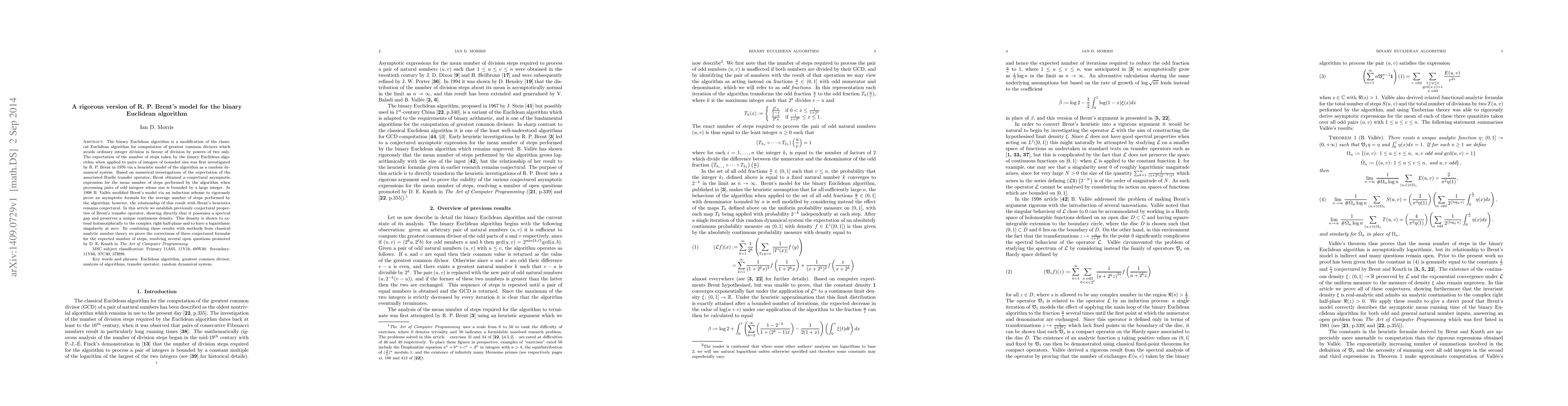 A paper refines Brent's binary Euclidean algorithm model, proving a spectral gap in its transfer operator and establishing a unique continuous density that resolves several open questions about the expected number of steps in the algorithm.