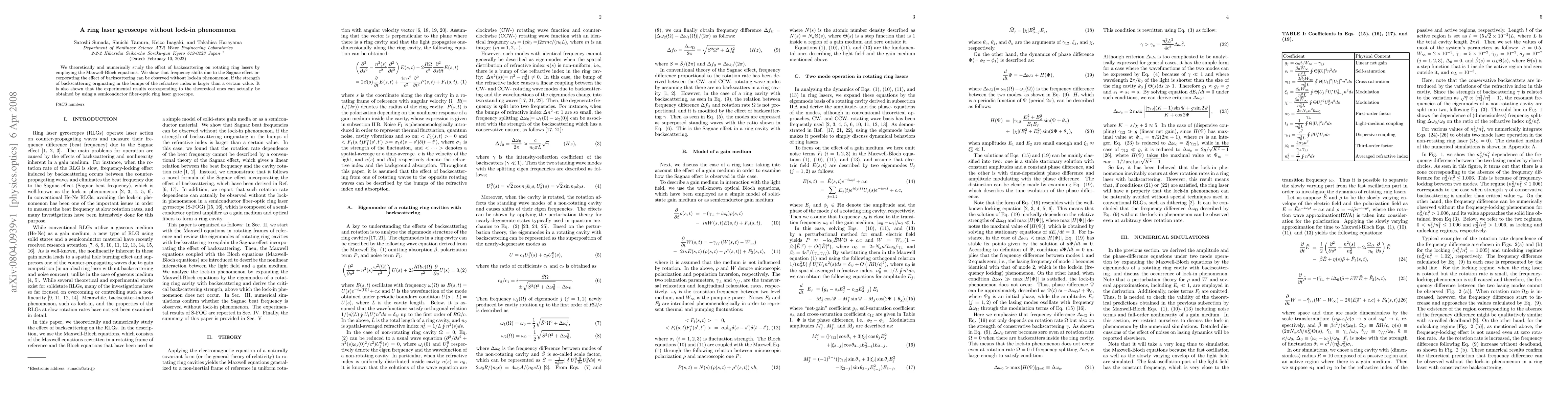 This paper investigates the impact of backscattering on ring laser gyroscopes using Maxwell-Bloch equations, demonstrating that significant backscattering can enable frequency shifts without the lock-in phenomenon, and validates these findings experimentally with a semiconductor fiber-optic ring laser gyroscope.