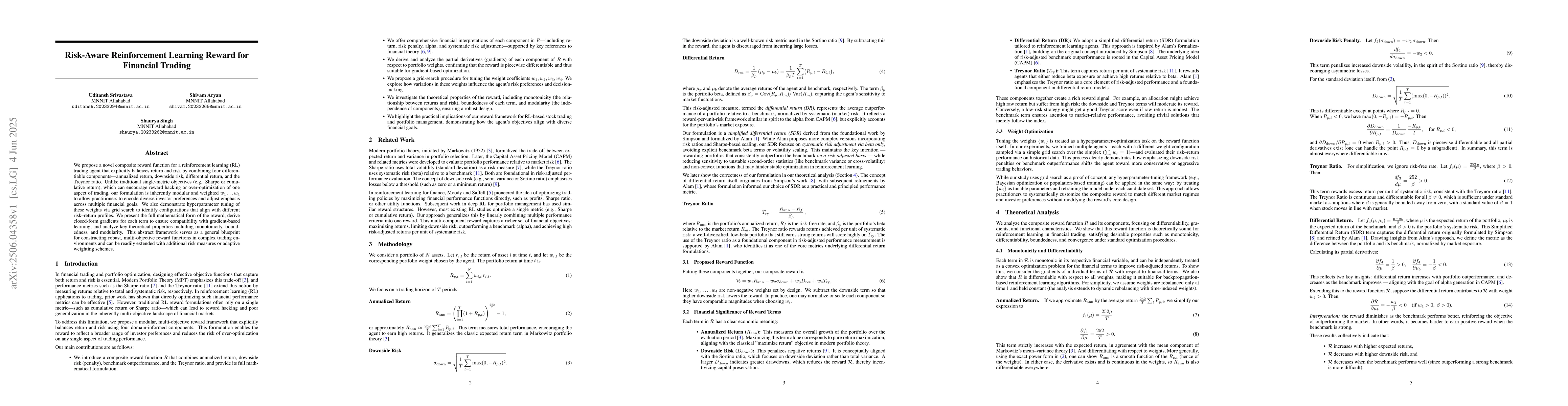 We propose a novel composite reward function for reinforcement learning in financial trading that balances return and risk using four differentiable terms: annualized return downside risk differential return and the Treynor ratio Unlike single metric objectives for example the Sharpe ratio our formulation is modular and parameterized by weights w1 w2 w3 and w4 enabling practitioners to encode diverse investor preferences We tune these weights via grid search to target specific risk return profiles We derive closed form gradients for each term to facilitate gradient based training and analyze key theoretical properties including monotonicity boundedness and modularity This framework offers a general blueprint for building robust multi objective reward functions in complex trading environments and can be extended with additional risk measures or adaptive weighting
