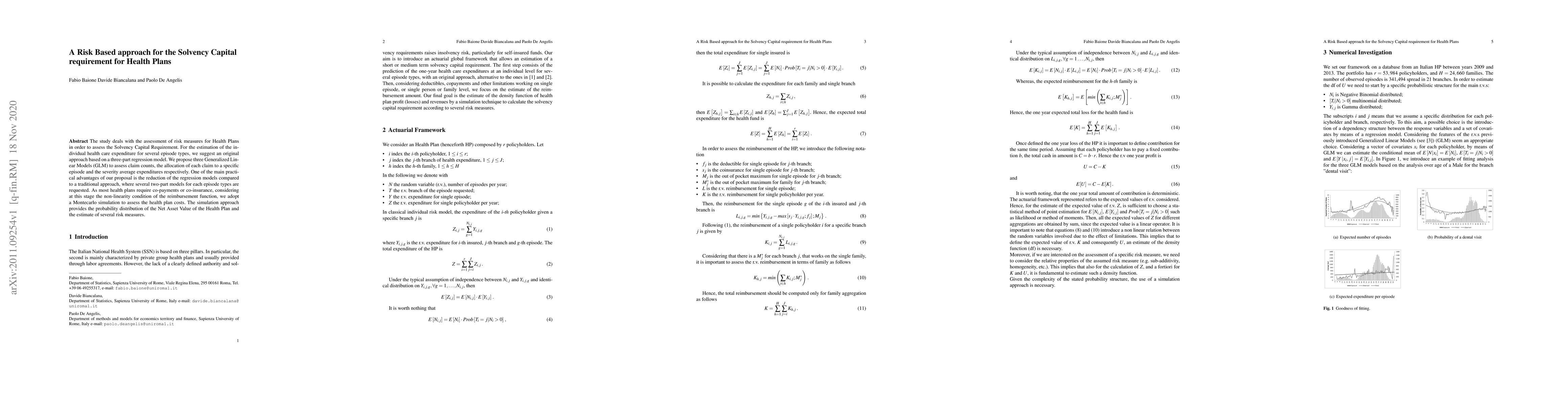 The study deals with the assessment of risk measures for Health Plans in order to assess the Solvency Capital Requirement. For the estimation of the individual health care expenditure for several episode types, we suggest an original approach based on a three-part regression model. We propose three Generalized Linear Models (GLM) to assess claim counts, the allocation of each claim to a specific episode and the severity average expenditures respectively. One of the main practical advantages of our proposal is the reduction of the regression models compared to a traditional approach, where several two-part models for each episode types are requested. As most health plans require co-payments or co-insurance, considering at this stage the non-linearity condition of the reimbursement function, we adopt a Montecarlo simulation to assess the health plan costs. The simulation approach provides the probability distribution of the Net Asset Value of the Health Plan and the estimate of several risk measures.