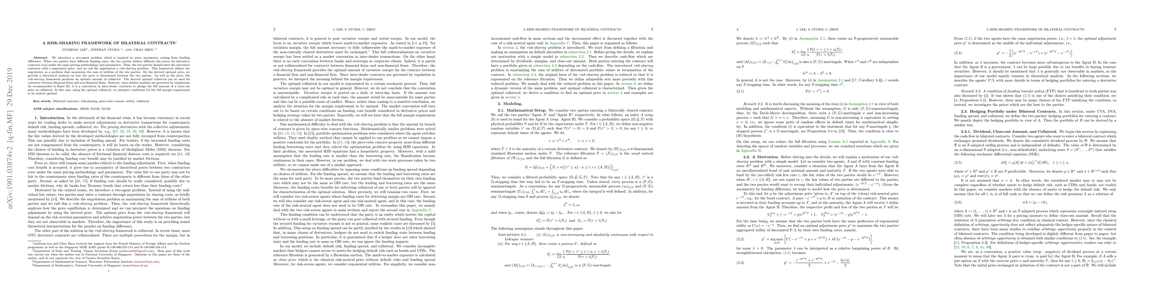 This paper presents a risk-sharing framework for bilateral contracts, addressing price discrepancies due to differing funding rates. It derives an optimal negotiated price and collateral amount, maximizing the sum of utilities for both parties. The framework also interprets conditions for full margin requirement in inter-dealer contracts under Basel III regulations.