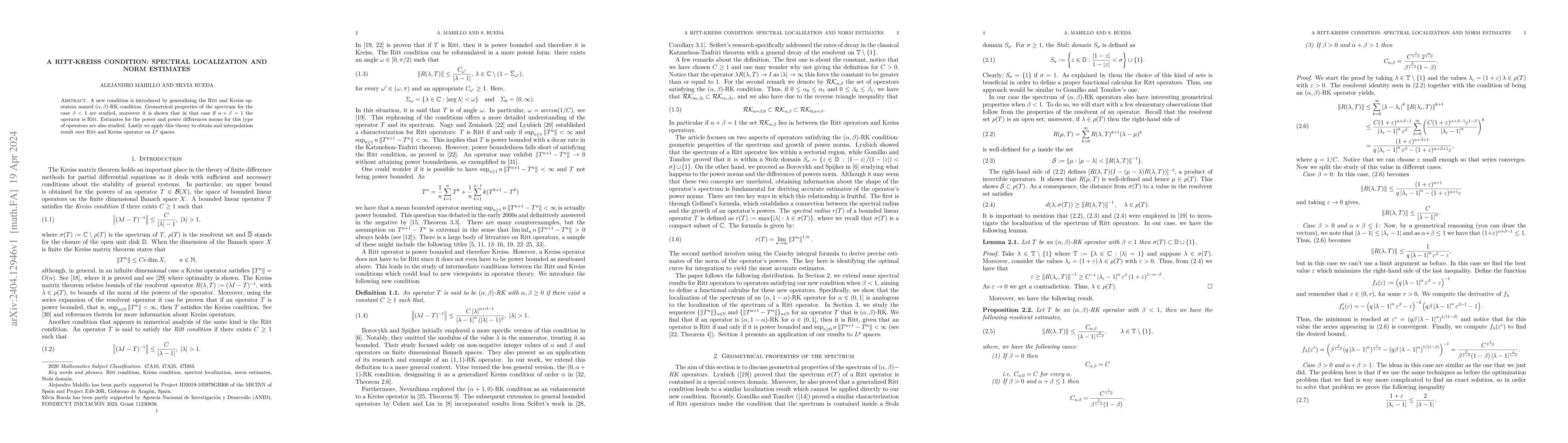 This paper introduces the $(\alpha, \beta)$-RK condition, a generalization of the Ritt and Kreiss operators. It explores the spectral localization and norm estimates for operators satisfying this condition, particularly when $\alpha + \beta = 1$, proving that such operators are Ritt. The study concludes with an application to obtain interpolation results over $L^p$ spaces.