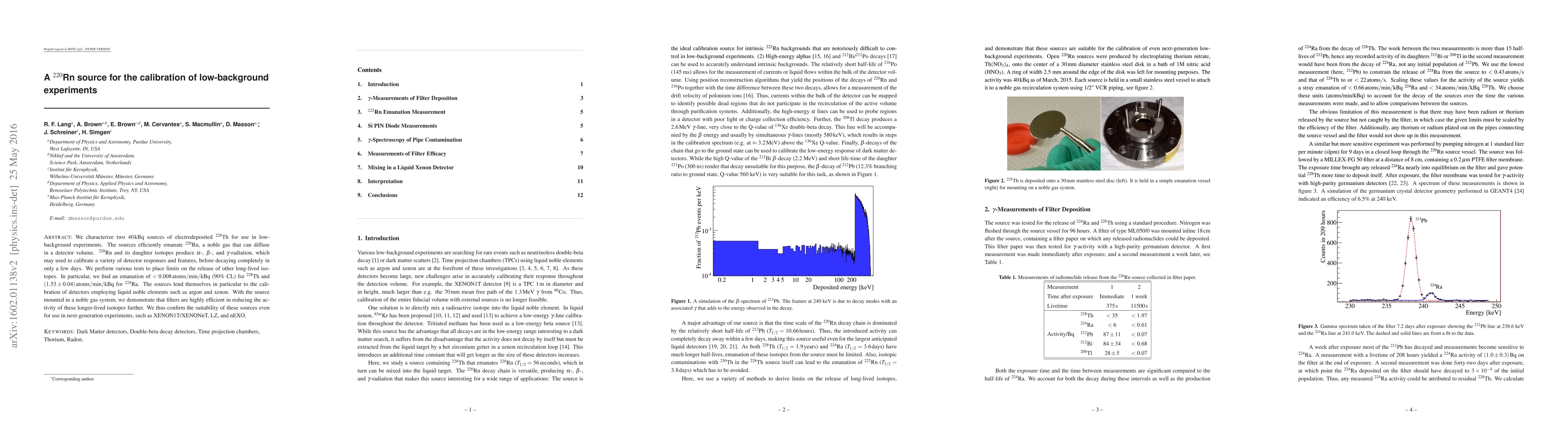 We characterize two 40 kBq sources of electrodeposited Th-228 for use in low-background experiments. The sources efficiently emanate Rn-220, a noble gas that can diffuse in a detector volume. Rn-220 and its daughter isotopes produce alpha, beta, and gamma-radiation, which may used to calibrate a variety of detector responses and features, before decaying completely in only a few days. We perform various tests to place limits on the release of other long-lived isotopes. In particular, we find an emanation of <0.008 atoms/min/kBq (90% CL) for Th-228 and 1.53 atoms/min/kBq for Ra-224. The sources lend themselves in particular to the calibration of detectors employing liquid noble elements such as argon and xenon. With the source mounted in a noble gas system, we demonstrate that filters are highly efficient in reducing the activity of these longer-lived isotopes further. We thus confirm the suitability of these sources even for use in next-generation experiments, such as XENON1T/XENONnT, LZ, and nEXO.