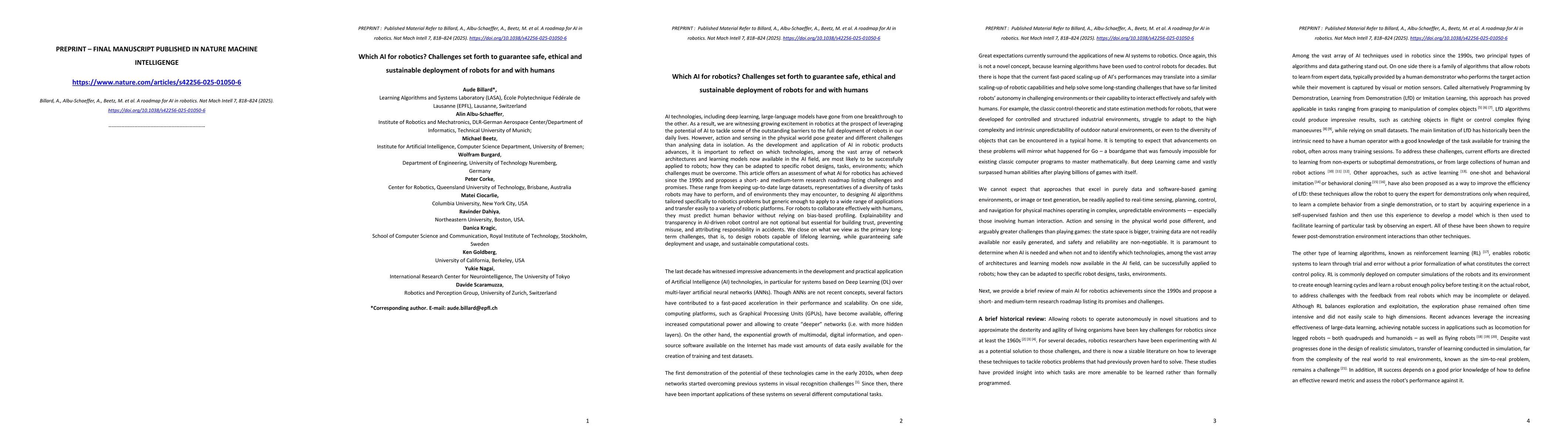 AI technologies, including deep learning, large-language models have gone from one breakthrough to the other. As a result, we are witnessing growing excitement in robotics at the prospect of leveraging the potential of AI to tackle some of the outstanding barriers to the full deployment of robots in our daily lives. However, action and sensing in the physical world pose greater and different challenges than analysing data in isolation. As the development and application of AI in robotic products advances, it is important to reflect on which technologies, among the vast array of network architectures and learning models now available in the AI field, are most likely to be successfully applied to robots; how they can be adapted to specific robot designs, tasks, environments; which challenges must be overcome. This article offers an assessment of what AI for robotics has achieved since the 1990s and proposes a short- and medium-term research roadmap listing challenges and promises. These range from keeping up-to-date large datasets, representatives of a diversity of tasks robots may have to perform, and of environments they may encounter, to designing AI algorithms tailored specifically to robotics problems but generic enough to apply to a wide range of applications and transfer easily to a variety of robotic platforms. For robots to collaborate effectively with humans, they must predict human behavior without relying on bias-based profiling. Explainability and transparency in AI-driven robot control are not optional but essential for building trust, preventing misuse, and attributing responsibility in accidents. We close on what we view as the primary long-term challenges, that is, to design robots capable of lifelong learning, while guaranteeing safe deployment and usage, and sustainable computational costs.