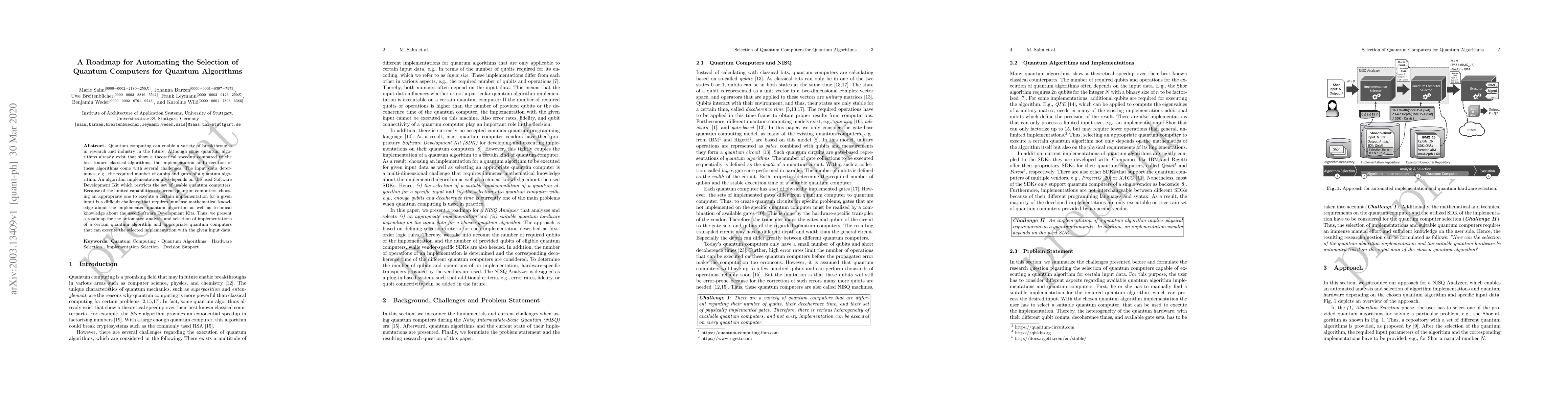Quantum computing can enable a variety of breakthroughs in research and industry in the future. Although some quantum algorithms already exist that show a theoretical speedup compared to the best known classical algorithms, the implementation and execution of these algorithms come with several challenges. The input data determines, e.g., the required number of qubits and gates of a quantum algorithm. An algorithm implementation also depends on the used Software Development Kit which restricts the set of usable quantum computers. Because of the limited capabilities of current quantum computers, choosing an appropriate one to execute a certain implementation for a given input is a difficult challenge that requires immense mathematical knowledge about the implemented quantum algorithm as well as technical knowledge about the used Software Development Kits. Thus, we present a roadmap for the automated analysis and selection of implementations of a certain quantum algorithm and appropriate quantum computers that can execute the selected implementation with the given input data.