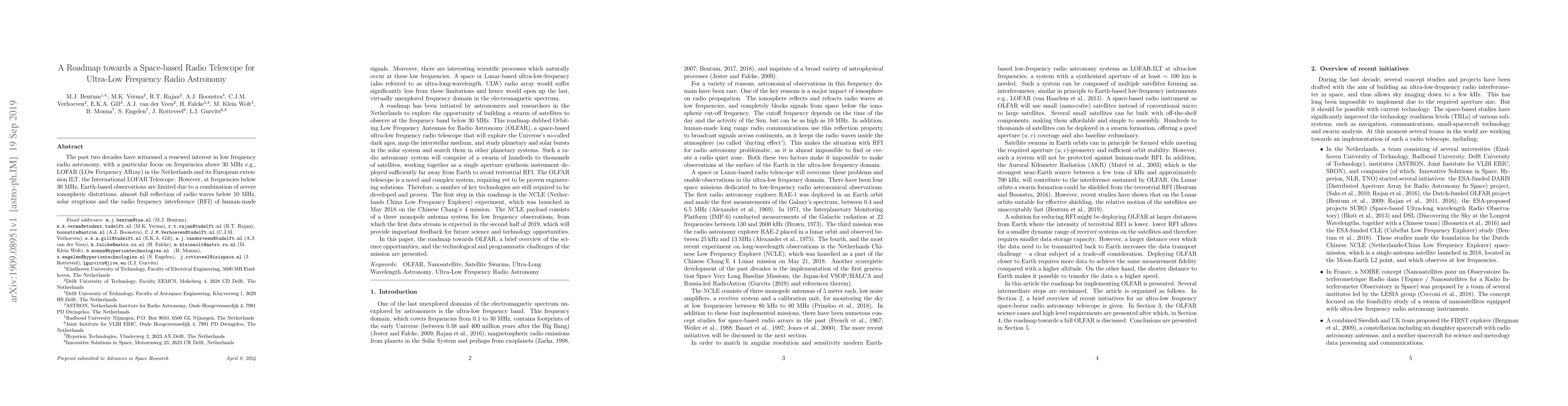 The past two decades saw a renewed interest in low frequency radio astronomy, with a particular focus on frequencies above 30 MHz. However, at frequencies below 30 MHz, Earth-based observations are limited due to a combination of severe ionospheric distortions, almost full reflection of radio waves below 10 MHz, solar eruptions and human-made radio frequency interference (RFI). A space or Lunar-based ultra-low-frequency (or ultra-long-wavelength, ULW) array would suffer significantly less from these limitations and hence would open up the last, virtually unexplored frequency domain in the electromagnetic spectrum. A roadmap has been initiated in order to explore the opportunity of building a swarm of satellites to observe at the frequency band below 30 MHz. This roadmap, dubbed Orbiting Low Frequency Antennas for Radio Astronomy (OLFAR), presents a space-based ultra-low frequency radio telescope that will explore the Universe's so-called dark ages, map the interstellar medium, and study planetary and solar bursts in the solar system and search them in other planetary systems. Such a system will comprise of a swarm of hundreds to thousands of satellites, working together as a single aperture synthesis instrument deployed sufficiently far away from Earth to avoid terrestrial RFI. A number of key technologies of OLFAR are still to be developed and proven. The first step in this roadmap is the NCLE (Netherlands China Low Frequency Explorer) experiment launched in May 2018 on the Chinese Chang'e-4 mission. The NCLE payload consists of a three monopole antenna system from which the first data stream is expected in the second half of 2019, which will provide important feedback for future science and technology opportunities. In this paper, the roadmap towards OLFAR, a brief overview of the science opportunities, and the technological and programmatic challenges of the mission are presented.