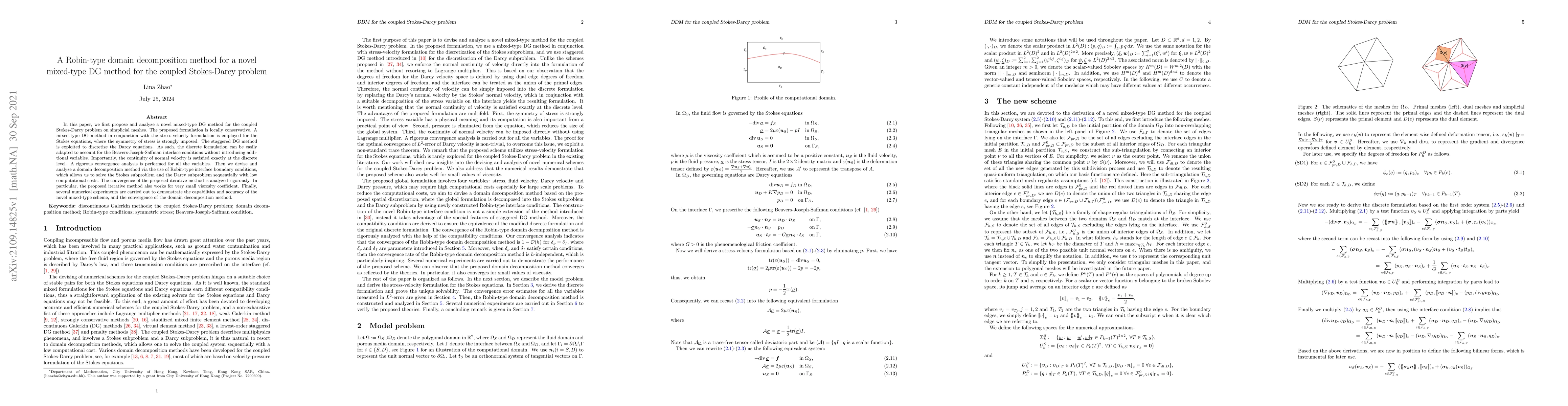 In this paper, we first propose and analyze a novel mixed-type DG method for the coupled Stokes-Darcy problem on simplicial meshes. The proposed formulation is locally conservative. A mixed-type DG method in conjunction with the stress-velocity formulation is employed for the Stokes equations, where the symmetry of stress is strongly imposed. The staggered DG method is exploited to discretize the Darcy equations. As such, the discrete formulation can be easily adapted to account for the Beavers-Joseph-Saffman interface conditions without introducing additional variables. Importantly, the continuity of normal velocity is satisfied exactly at the discrete level. A rigorous convergence analysis is performed for all the variables. Then we devise and analyze a domain decomposition method via the use of Robin-type interface boundary conditions, which allows us to solve the Stokes subproblem and the Darcy subproblem sequentially with low computational costs. The convergence of the proposed iterative method is analyzed rigorously. In particular, the proposed iterative method also works for very small viscosity coefficient. Finally, several numerical experiments are carried out to demonstrate the capabilities and accuracy of the novel mixed-type scheme, and the convergence of the domain decomposition method.