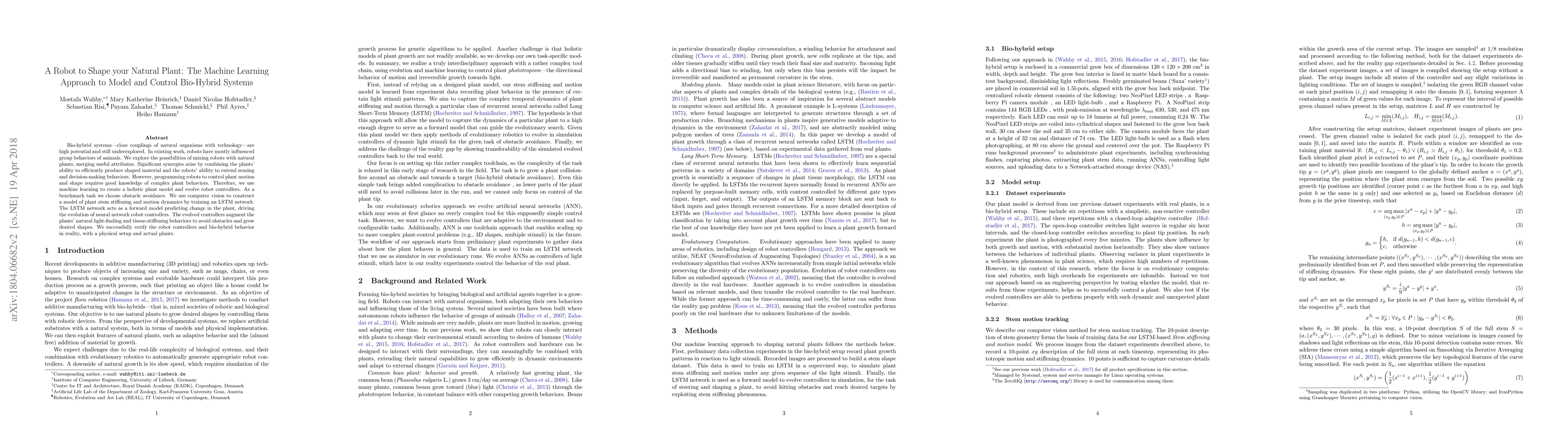 Bio-hybrid systems---close couplings of natural organisms with technology---are high potential and still underexplored. In existing work, robots have mostly influenced group behaviors of animals. We explore the possibilities of mixing robots with natural plants, merging useful attributes. Significant synergies arise by combining the plants' ability to efficiently produce shaped material and the robots' ability to extend sensing and decision-making behaviors. However, programming robots to control plant motion and shape requires good knowledge of complex plant behaviors. Therefore, we use machine learning to create a holistic plant model and evolve robot controllers. As a benchmark task we choose obstacle avoidance. We use computer vision to construct a model of plant stem stiffening and motion dynamics by training an LSTM network. The LSTM network acts as a forward model predicting change in the plant, driving the evolution of neural network robot controllers. The evolved controllers augment the plants' natural light-finding and tissue-stiffening behaviors to avoid obstacles and grow desired shapes. We successfully verify the robot controllers and bio-hybrid behavior in reality, with a physical setup and actual plants.